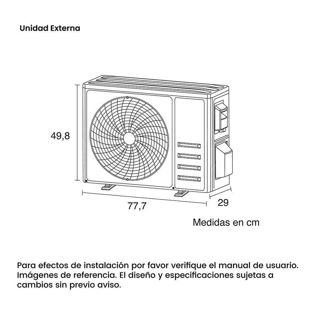 Con un nivel de ruido de solo 39 dB, este aire acondicionado es ideal para dormitorios y espacios de trabajo, asegurando un descanso placentero sin interrupciones. Su diseño compacto y ligero, con un peso de 12 kg para la unidad interna y 26 kg para la unidad externa, facilita su integración en cualquier entorno.