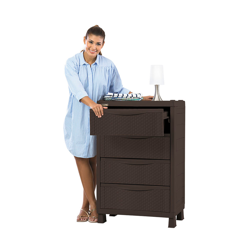 Cajonero con gran capacidad de almacenamiento. Tiene 4 cajones grandes con sistema de fácil apertura gracias al diseño del sistema de rodamiento integrado sin piezas metálicas. Manijas ergonómica y no requiere ensamble. Muy decorativo por su apariencia rattán. Beneficios 4 Entrepaños regulables. Resiste hasta 20 kg por entrepaño. Fácil de mover. Diseño atractivo que imita el rattan, añadiendo estilo. Múltiples gavetas para almacenamiento eficiente. Fabricado en materiales duraderos y fáciles de limpiar. Versátil para uso en diversos espacios del hogar. Aporta un toque natural y sofisticado a la decoración. Solución de almacenamiento que maximiza el espacio y el orden.