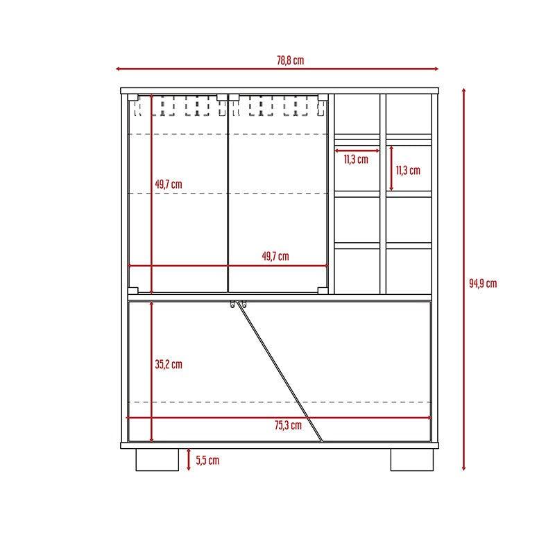 Bar, 2 puertas de vidrio con apertura push, variedad de entrepaños porta copas y botellas.