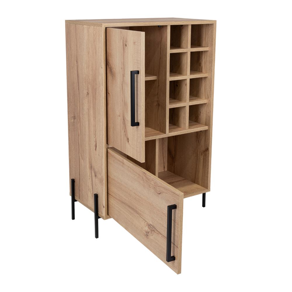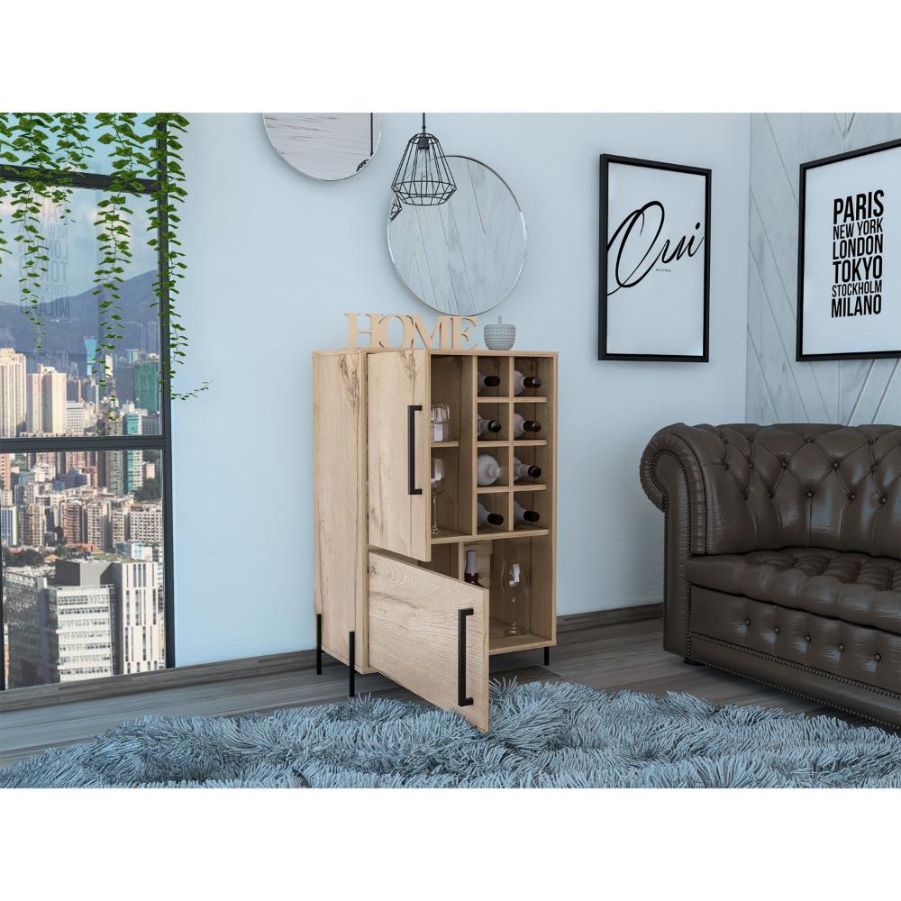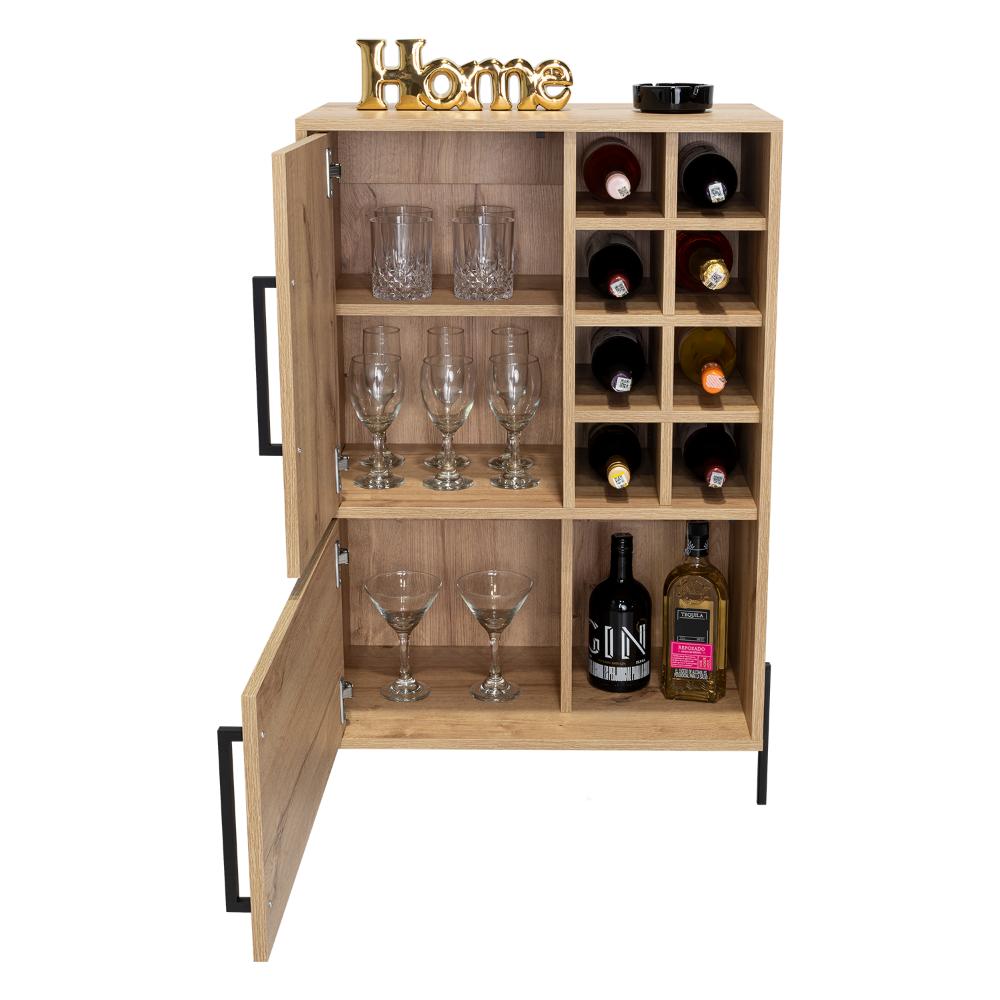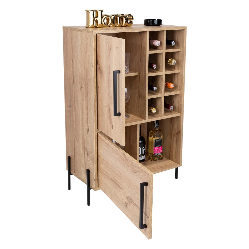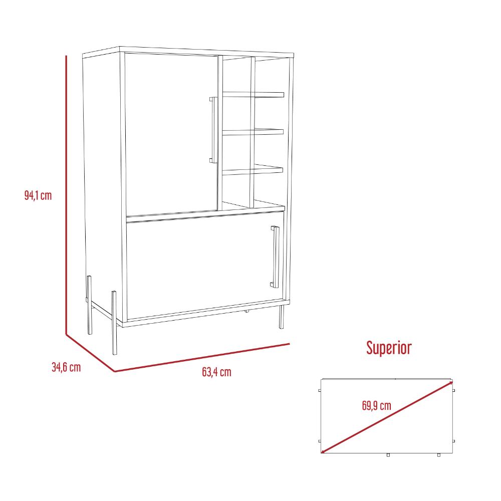 Bar, con espacio para almacenar botellas y objetos de bar, entrepaños internos, puerta abatible para almacenamiento, y patas metalicas.