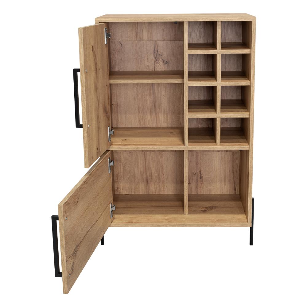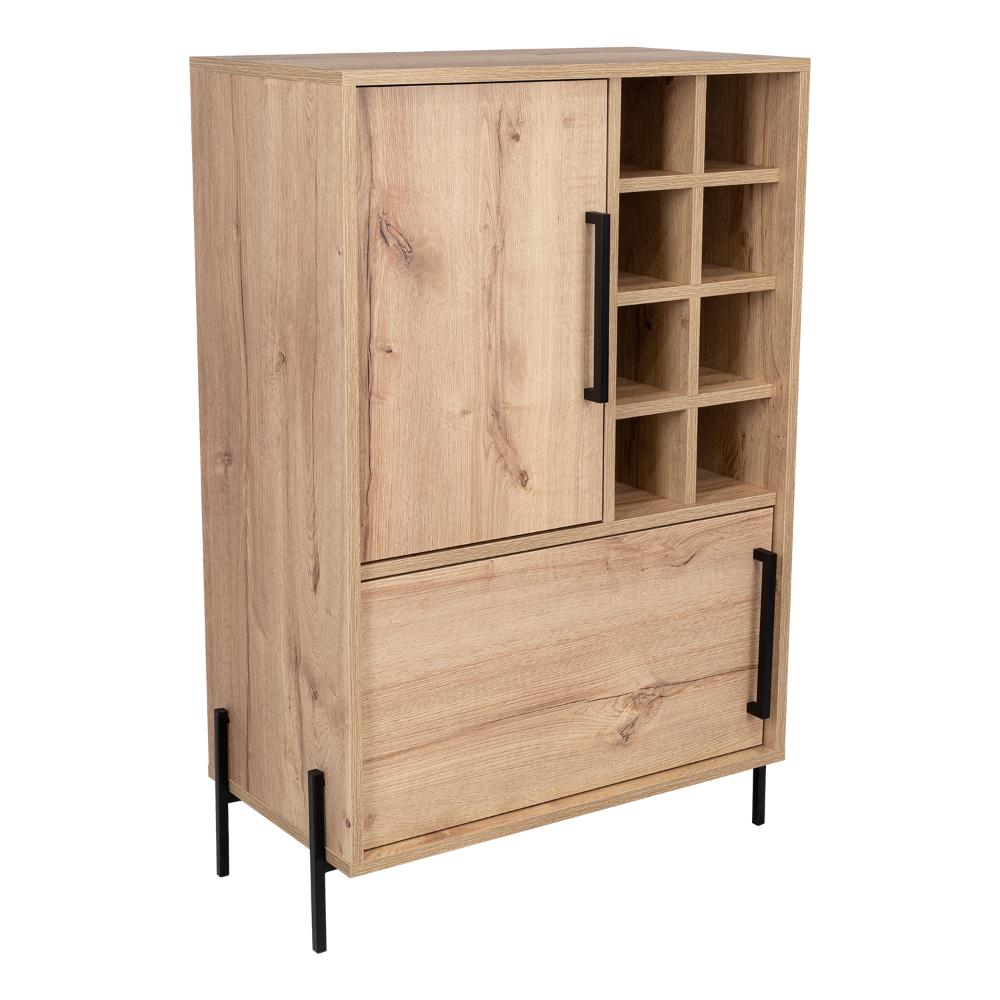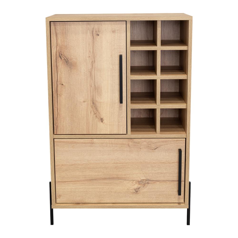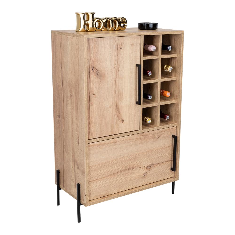 Bar, con espacio para almacenar botellas y objetos de bar, entrepaños internos, puerta abatible para almacenamiento, y patas metalicas.