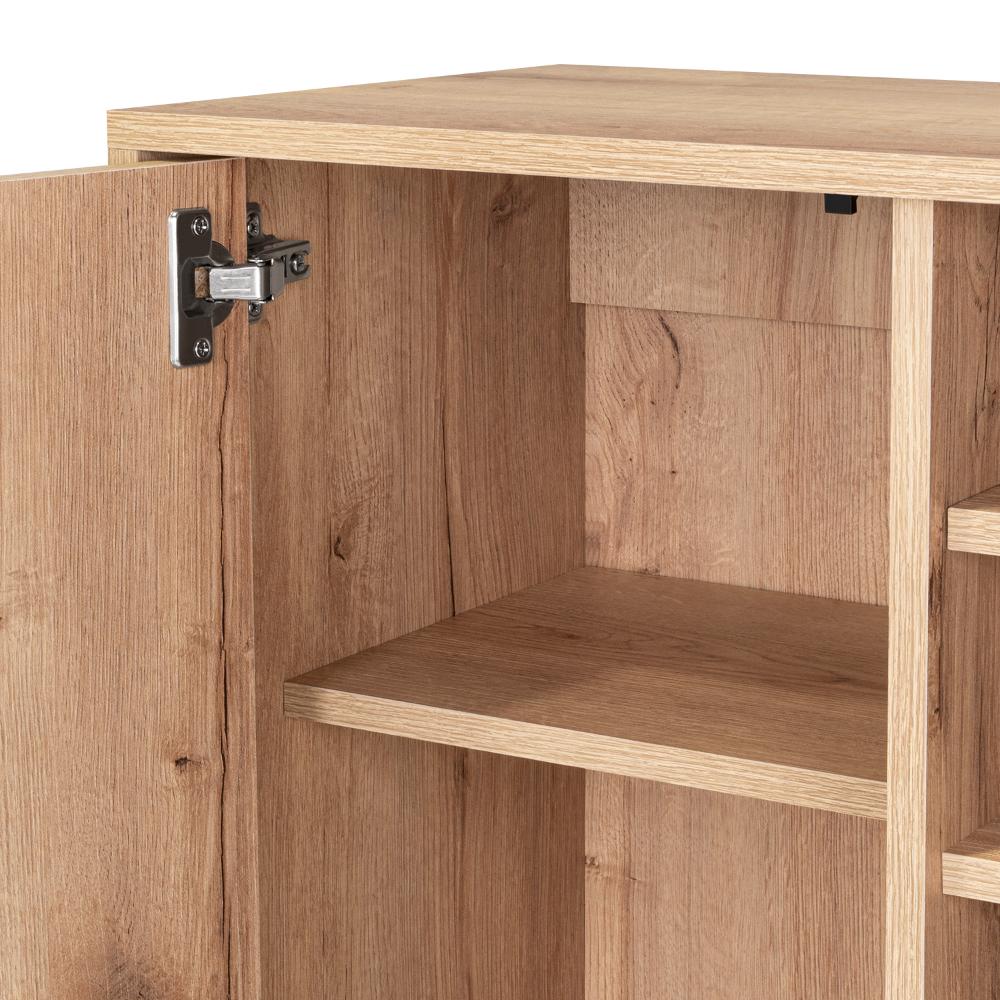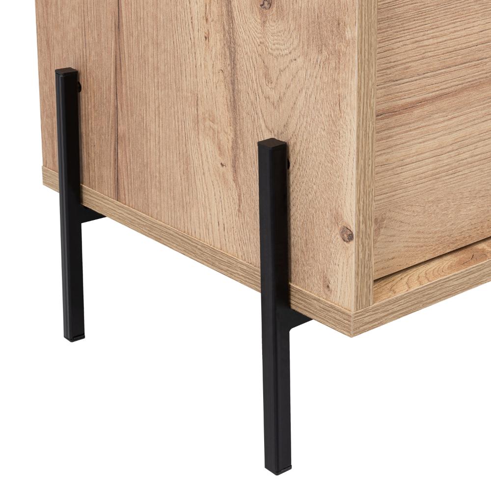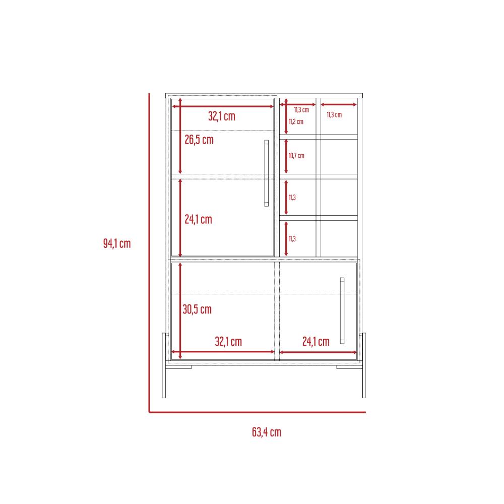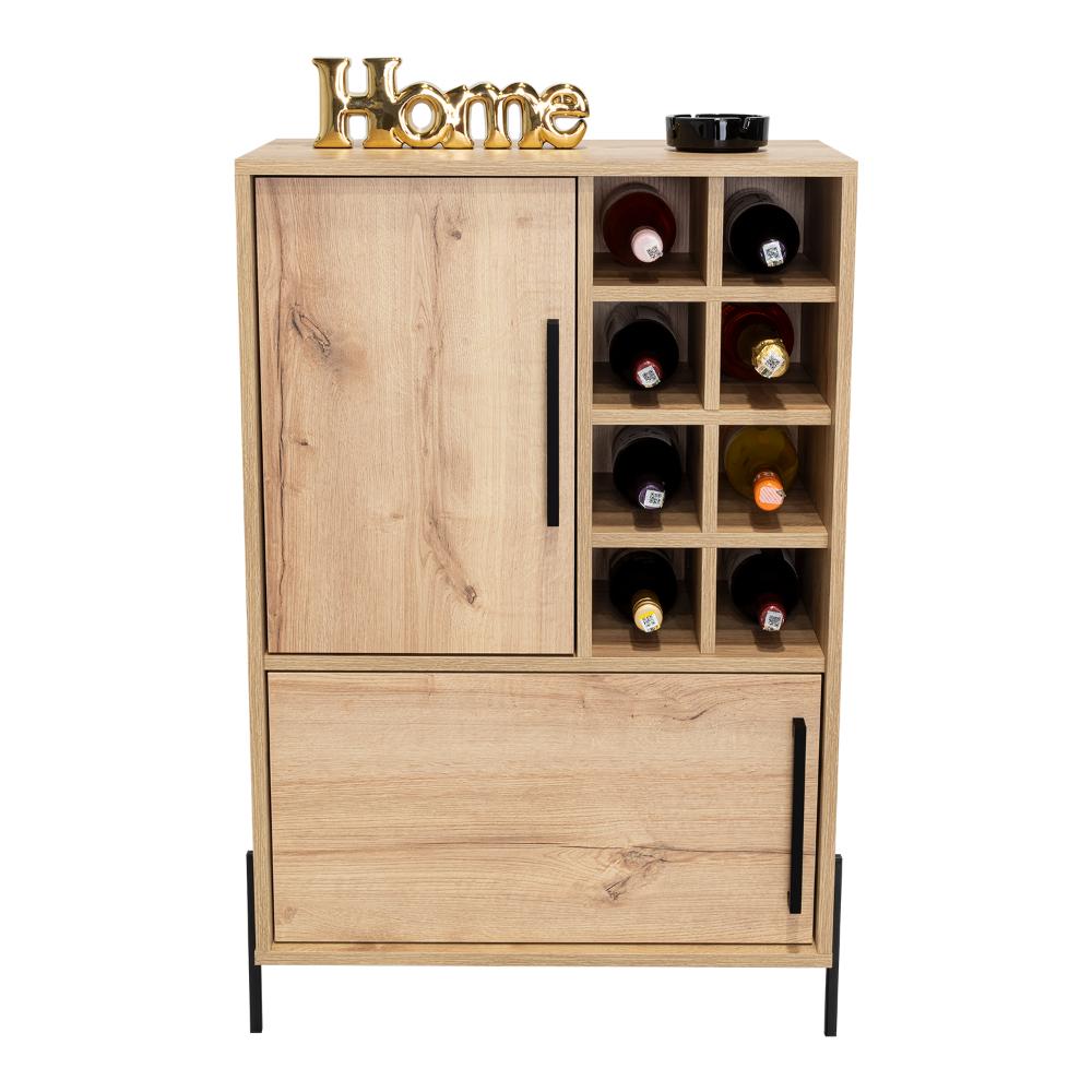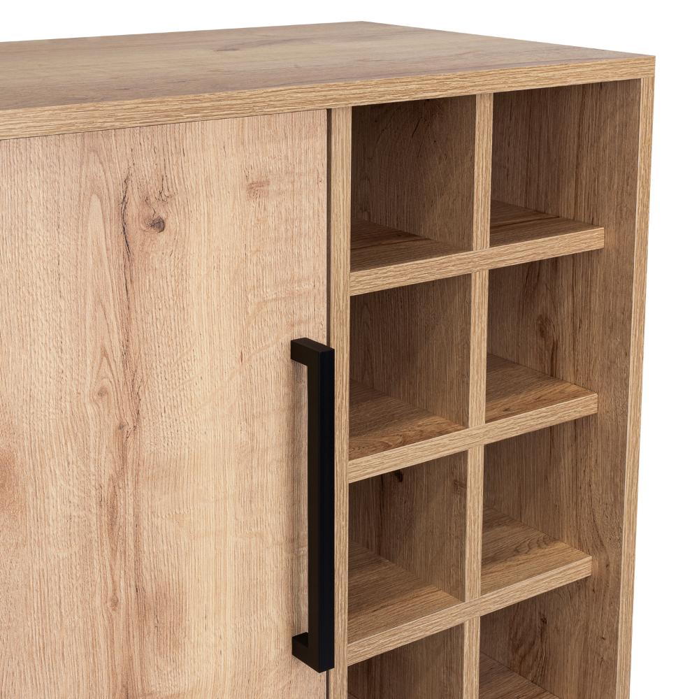 Bar, con espacio para almacenar botellas y objetos de bar, entrepaños internos, puerta abatible para almacenamiento, y patas metalicas.