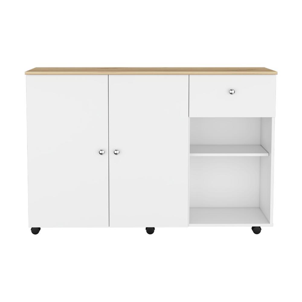 Barra de Cocina, amplia superficie en la mesa, dos puertas batientes, un cajón para almacenar objetos, dos entrepaños internos para almacenamiento, rodachinas