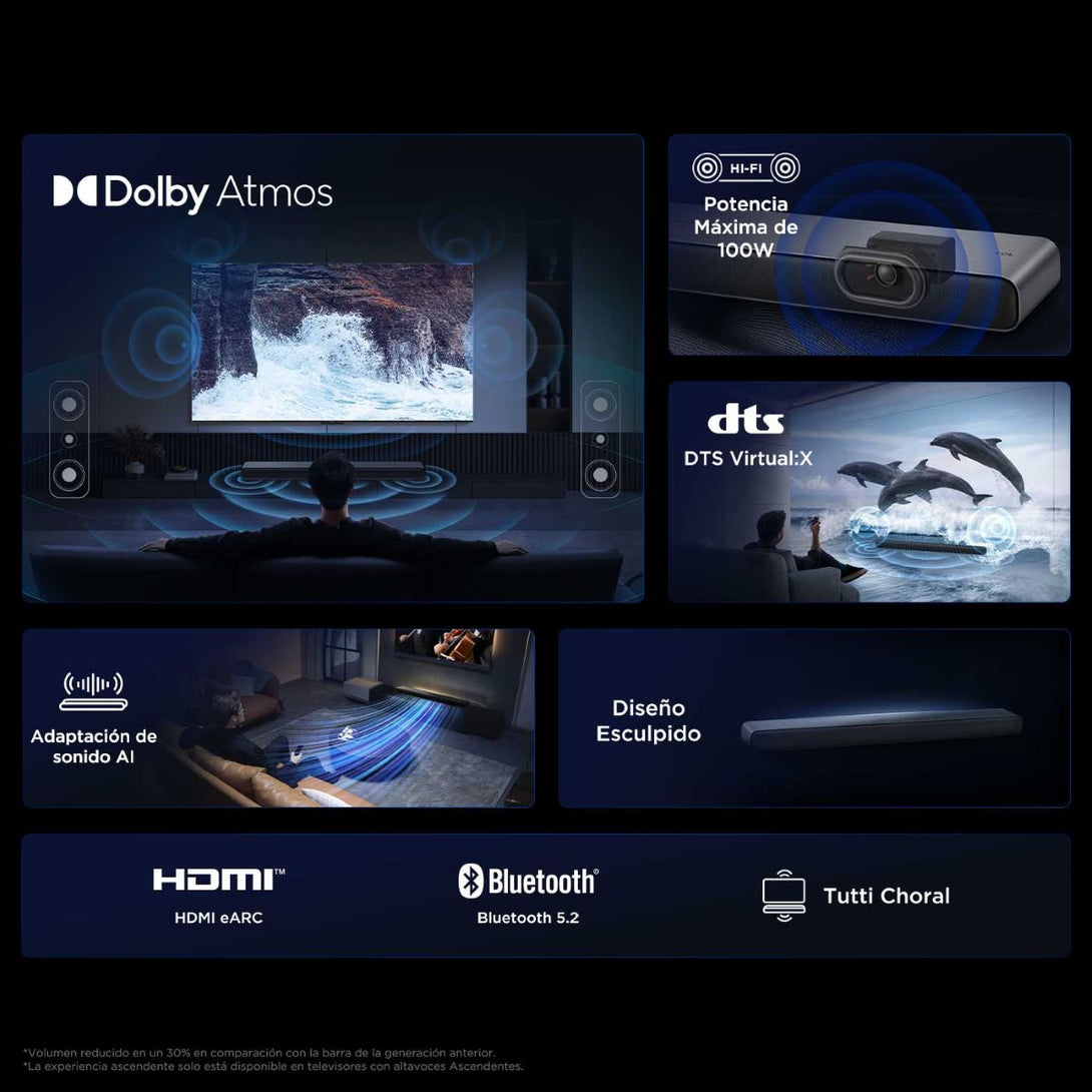 Barra de Sonido TCL S45H La barra de sonido TCL S45H incluye Dolby Atmos para una experiencia de sonido envolvente e inmersiva. Con Tutti Choral, puedes reproducir el audio del TV y la barra simultáneamente, mejorando la calidad auditiva. Su potencia de 40W y los múltiples modos de sonido aseguran una experiencia auditiva óptima. Es compatible con la app TCL Home, lo que permite un control intuitivo desde tu celular, además de conectividad Bluetooth para usar con otros dispositivos.