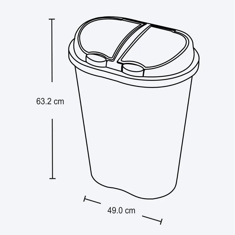 Basurero Pedal Doble. Capacidad total de 50 Litros. El contenedor cuenta con separadores de bolsas para separación de resiudos. Cuenta con una base que fijan la bola al cuerpo . Sistema push (empuje) que evita contacto con residuos. Marcación sobre tapa para Negro No Aprovechable y Verde Organizoc Aprovechable. El contenedor de color negro son para depositar los residuos no aprovechables como, servilletas, papel y cartón con comida, papel metalizado, papel higiénico. El contenedor de color verde son para depositar residuos orgánicos aprovechables como restos de comida.