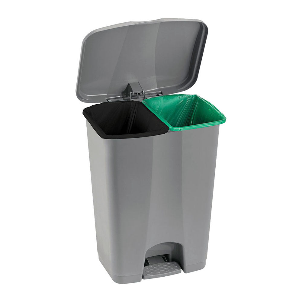 Basurero Pedal Doble de 60 Litros. Separa en un solo contenedor con dos bolsas. Sistema pedal que evita contacto con residuos. El contenedor de color negro son para depositar los residuos no aprovechables como, servilletas, papel y cartón con comida, papel metalizado, papel higiénico. El contenedor de color verde son para depositar residuos orgánicos aprovechables como restos de comida. Beneficios: Diseño doble para separar basura y reciclaje fácilmente. Capacidad de 60 litros, adecuada para uso familiar o de oficina. Pedal para una apertura sin manos, manteniendo la higiene. Fabricado con materiales duraderos y resistentes. Promueve un estilo de vida ecológico con gestión eficiente de residuos. Diseño moderno que complementa cualquier espacio.