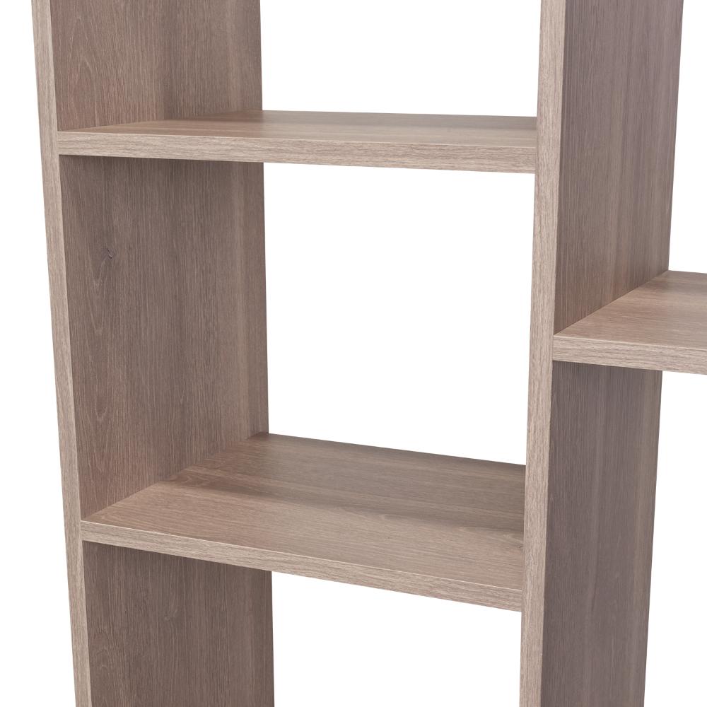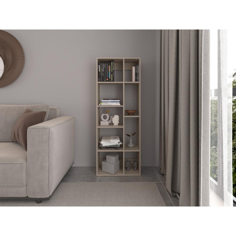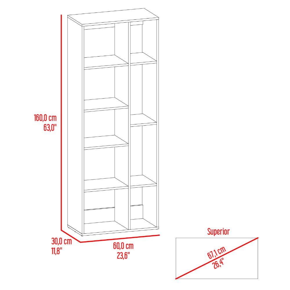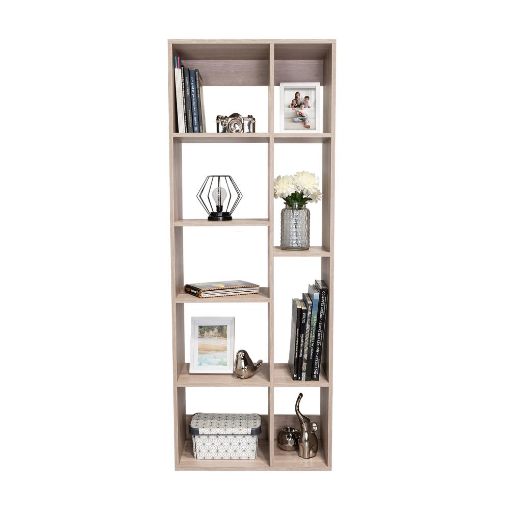 Biblioteca, con diseño minimalista, compartimientos para objetos de estudio o decorativos, múltiples entrepaños y superficies para ubicar objetos.