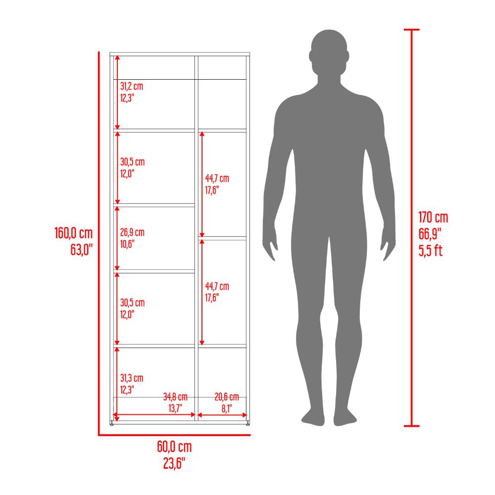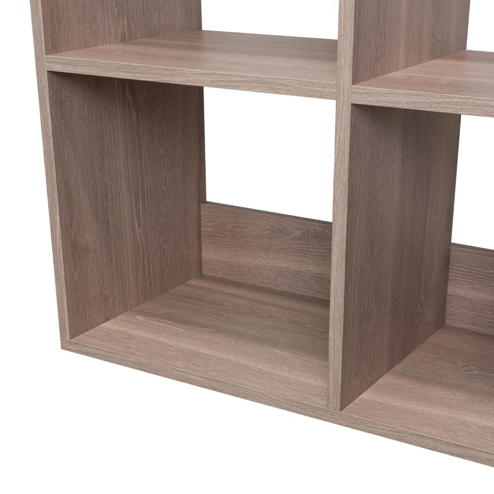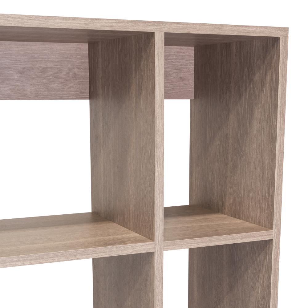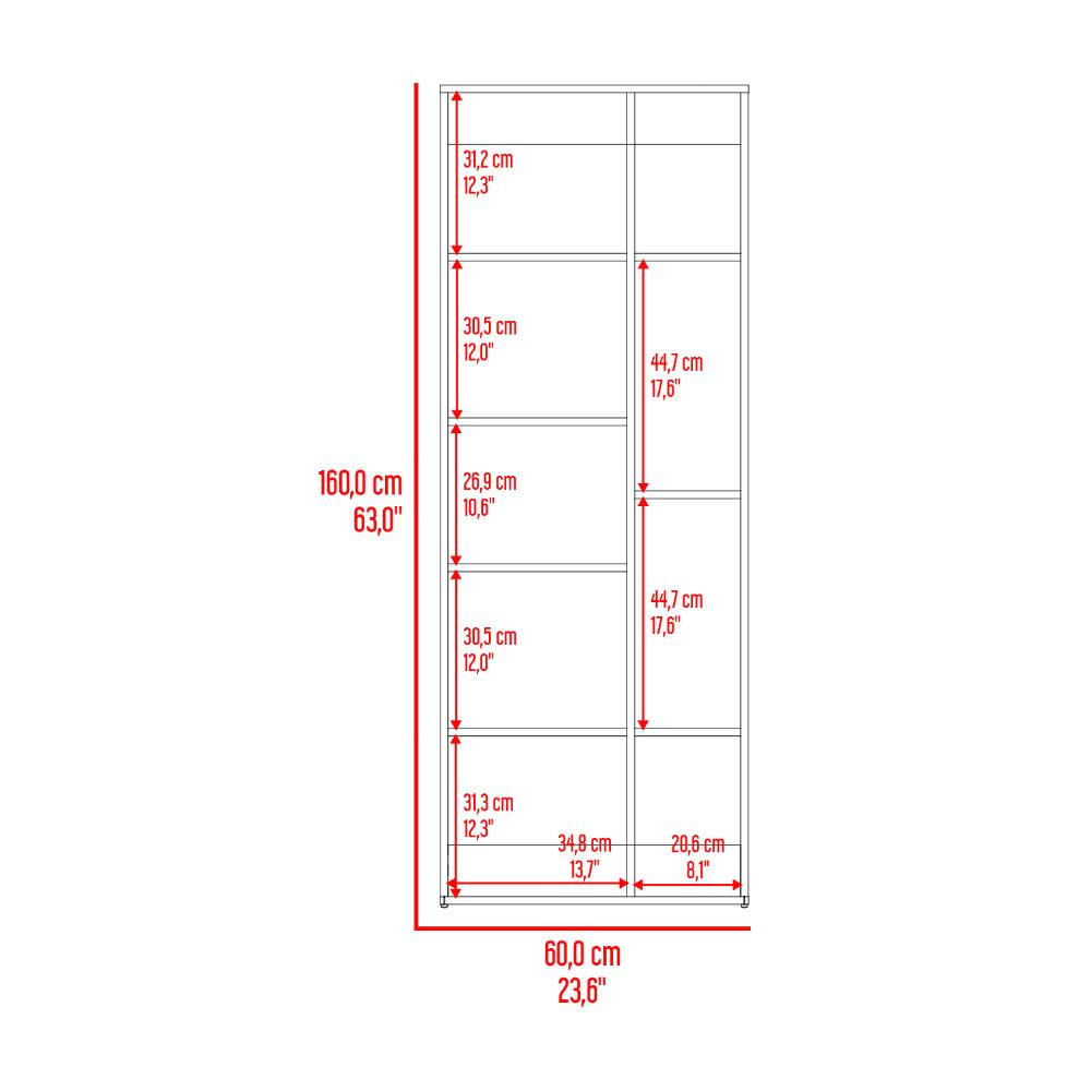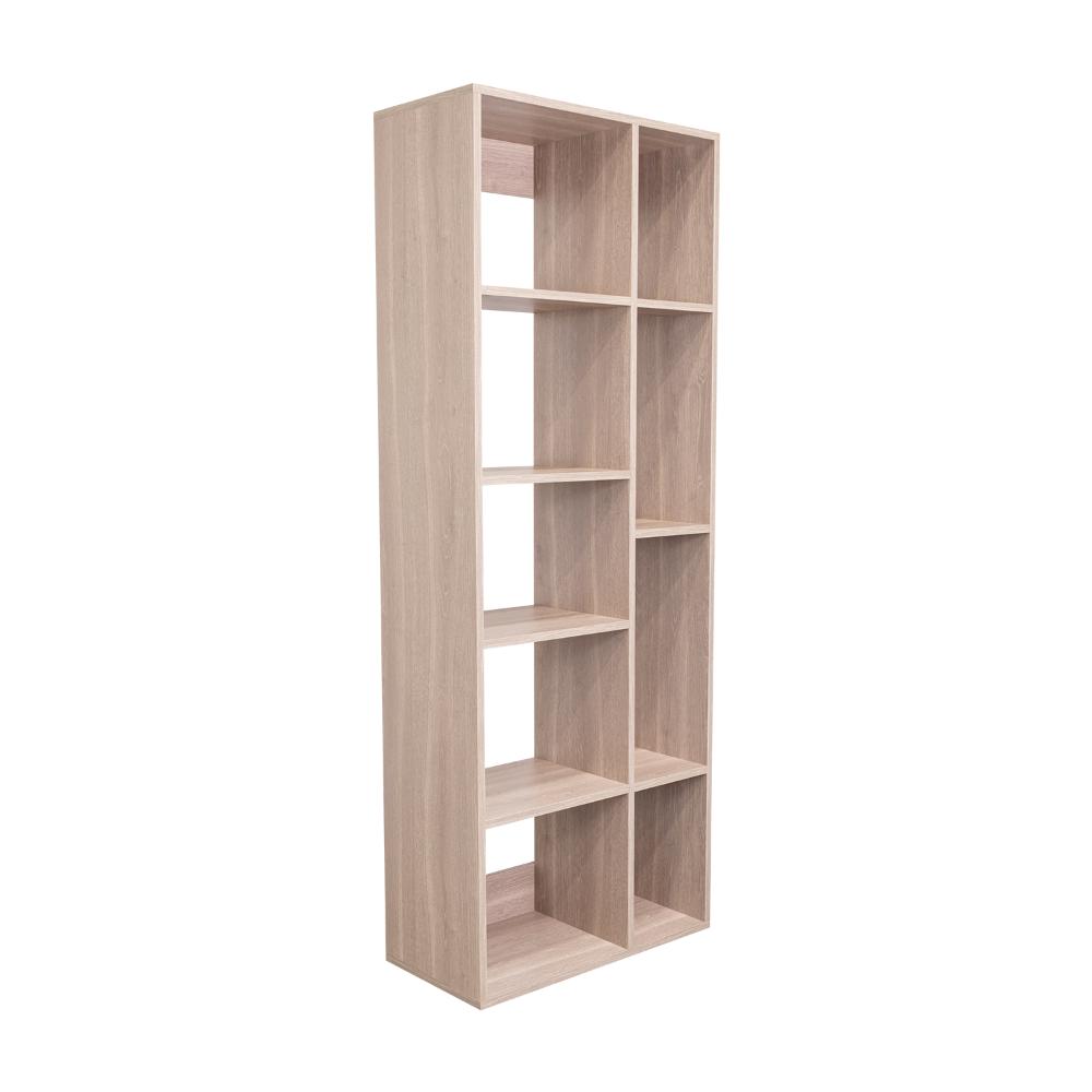 Biblioteca, con diseño minimalista, compartimientos para objetos de estudio o decorativos, múltiples entrepaños y superficies para ubicar objetos.