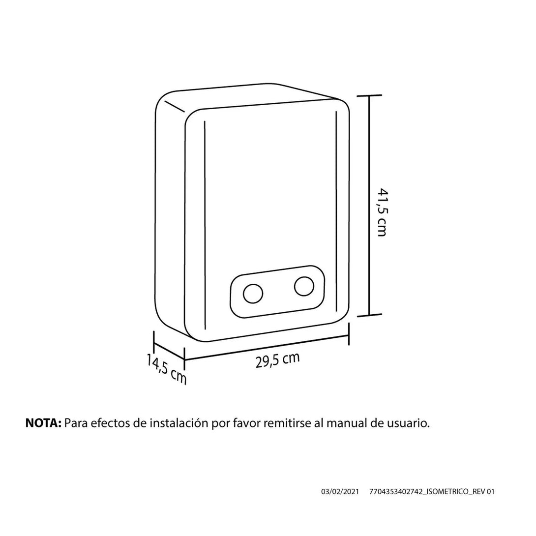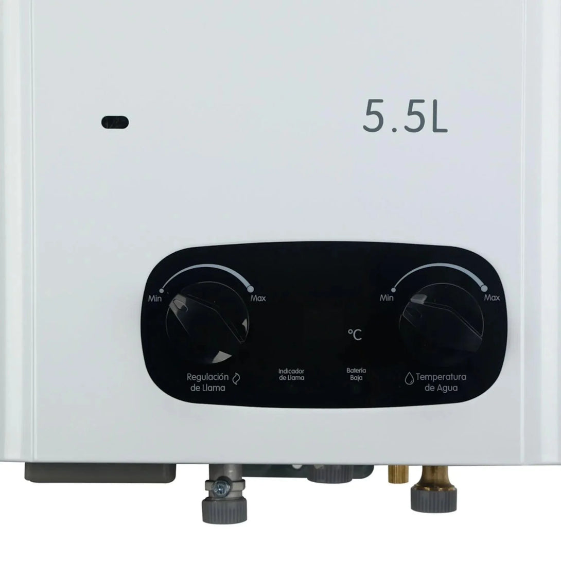 Calentador de agua, paso a gas natural, capacidad de 5,5 Lts por minuto, tiro natural, temperatura regulable y Display indicador para visualizar la temperatura de salida del agua e información de funcionamiento. Operación automática, no requiere ducto de evacuación, perillas de fácil manejo para controlar la temperatura del agua y el ahorro del gas, además cuenta con visor de llama para observar el funcionamiento del quemador, sistema de seguridad y temporizador que apaga el calentador luego de 20 minutos de uso continuo.