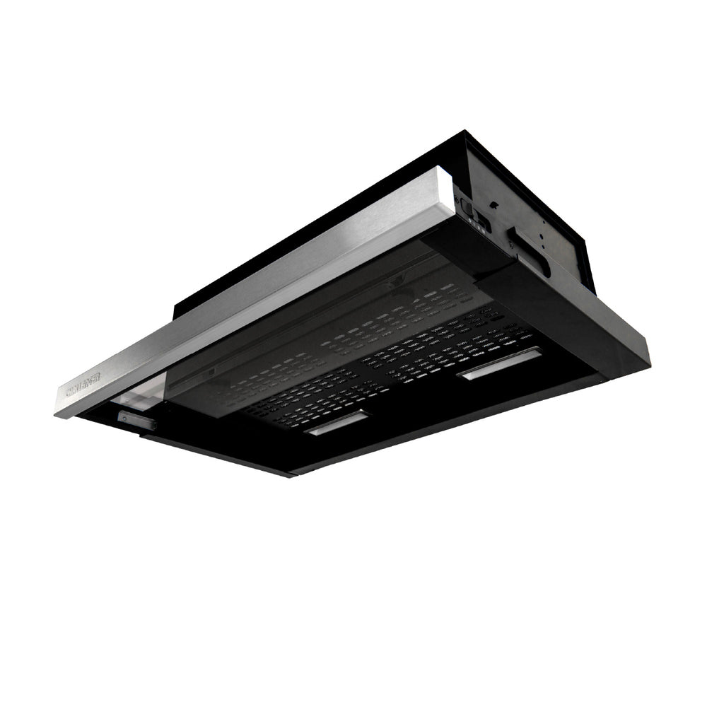• Campana telescópica extraplana con frente en acero inoxidable o en cristal negro de 60 cm de fácil limpieza, embebida en el mueble de la cocina, creando un ambiente elegante, cómodo y agradable.