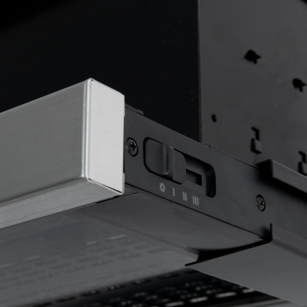 • Control manual lateral tipo corredera de 4 posiciones, que permite seleccionar las diferentes velocidades con apagado automático del motor al cerrar la visera de la campana.