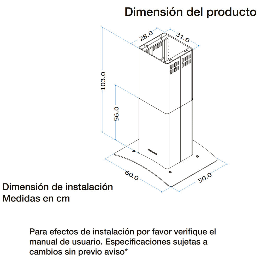 La altura del cubretubo es ajustable, con un rango que va de 56 cm a 103 cm, lo que permite una instalación personalizada según tus preferencias. Además, su iluminación incorporada proporciona una visibilidad óptima en la zona de cocción, mejorando la experiencia culinaria. Con un peso de 17 kg, la Campana Challenger CX 4660 es robusta y duradera, diseñada para ofrecer un rendimiento confiable a lo largo del tiempo."