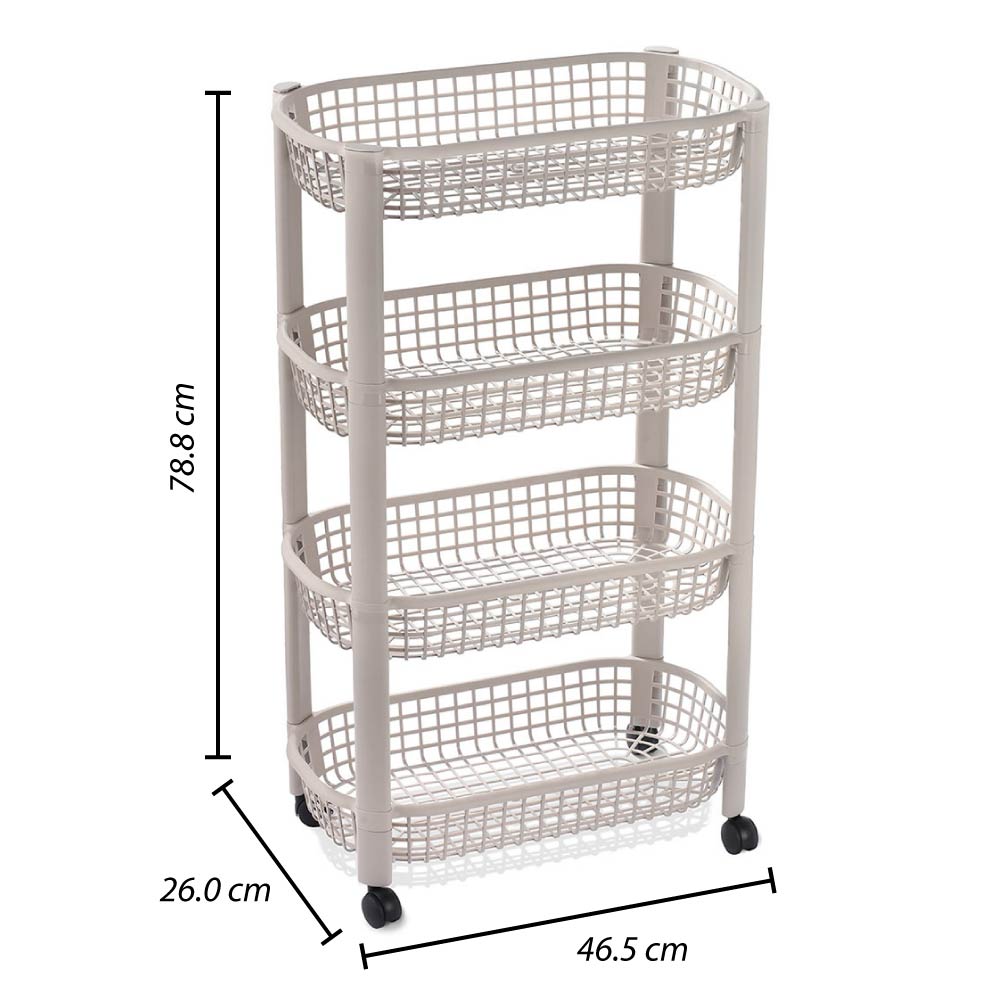 Canasta que incluye cuatro niveles para organizar. Tiene rodachinas. Fácil de armar, no requiere herramientas. Ideal para organizar en casa todo tipo de objetos. Úsala en cocina, baños, cuartos de niños, como organizador auxiliar.