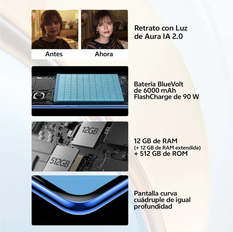 Cuenta con una pantalla AMOLED de 6.77 pulgadas y está potenciado por un procesador Snapdragon 7 Gen 3 con hasta 12GB de RAM y 512GB de almacenamiento. Su cámara dual tiene dos sensores de 50MP y cuenta con OIS, sumando una cámara selfie de la misma resolución. Alimentado por una batería de 6000 mAh de carga rápida, el Vivo V50 completa sus características con parlantes stereo, lector de huellas bajo pantalla. y resistencia al polvo y agua.