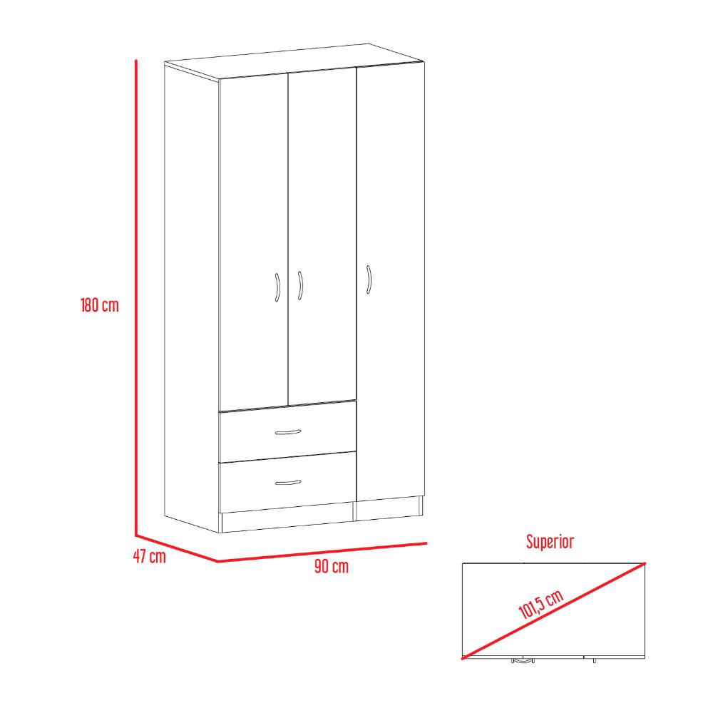Closet, con 3 puertas, 2 cajones, un tubo para colgar ropa, amplios espacios para guardar ropa y otros elementos.