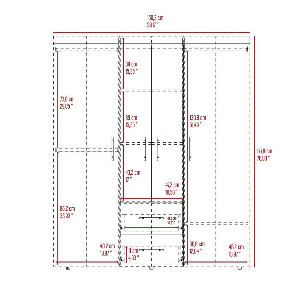 Closet, con cuatro puertas batientes, dos cajones, tres tubos pata colgar ropa y amplios espacios de guardado.