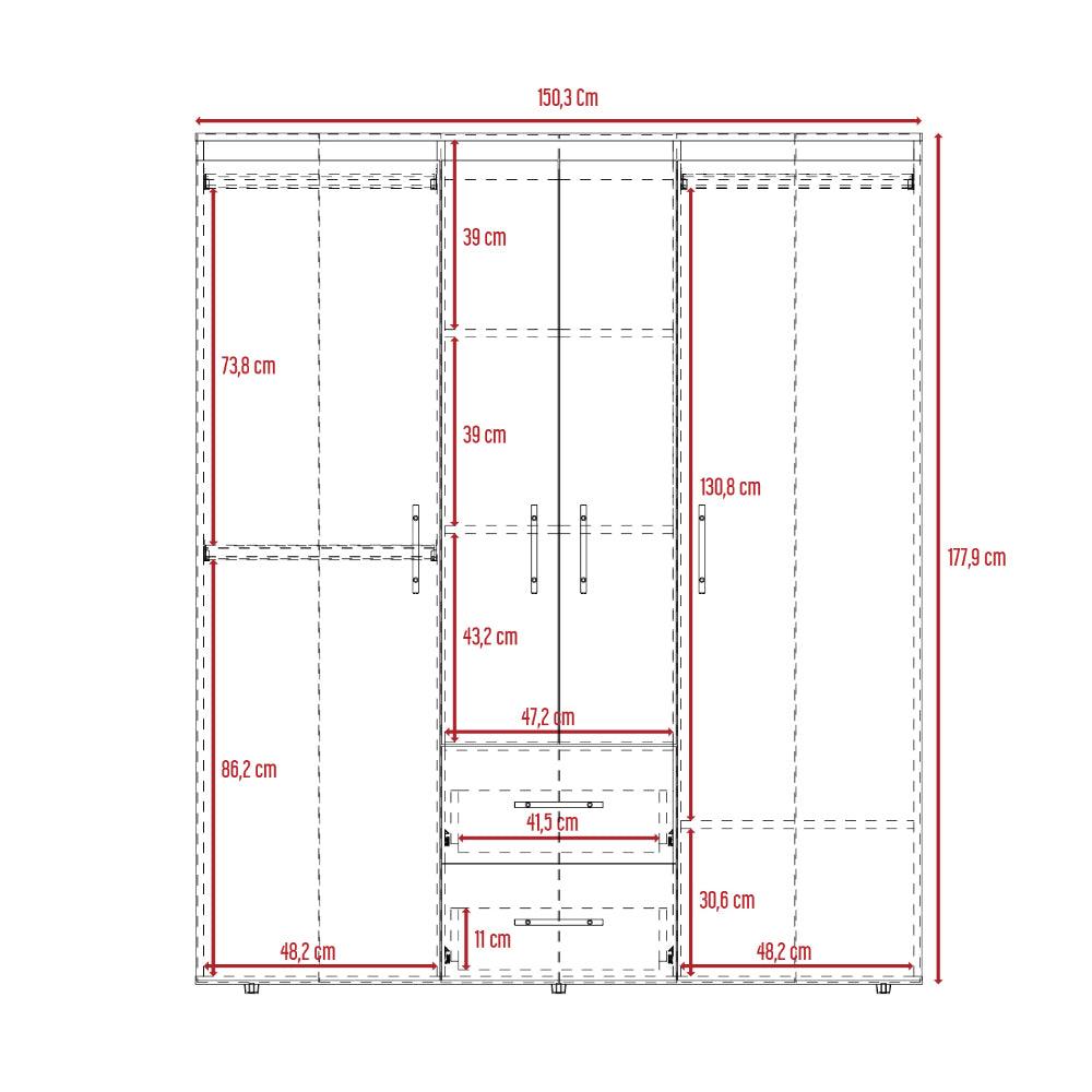 Closet, con cuatro puertas batientes, dos cajones, tres tubos pata colgar ropa y amplios espacios de guardado. Con manijas doradas.