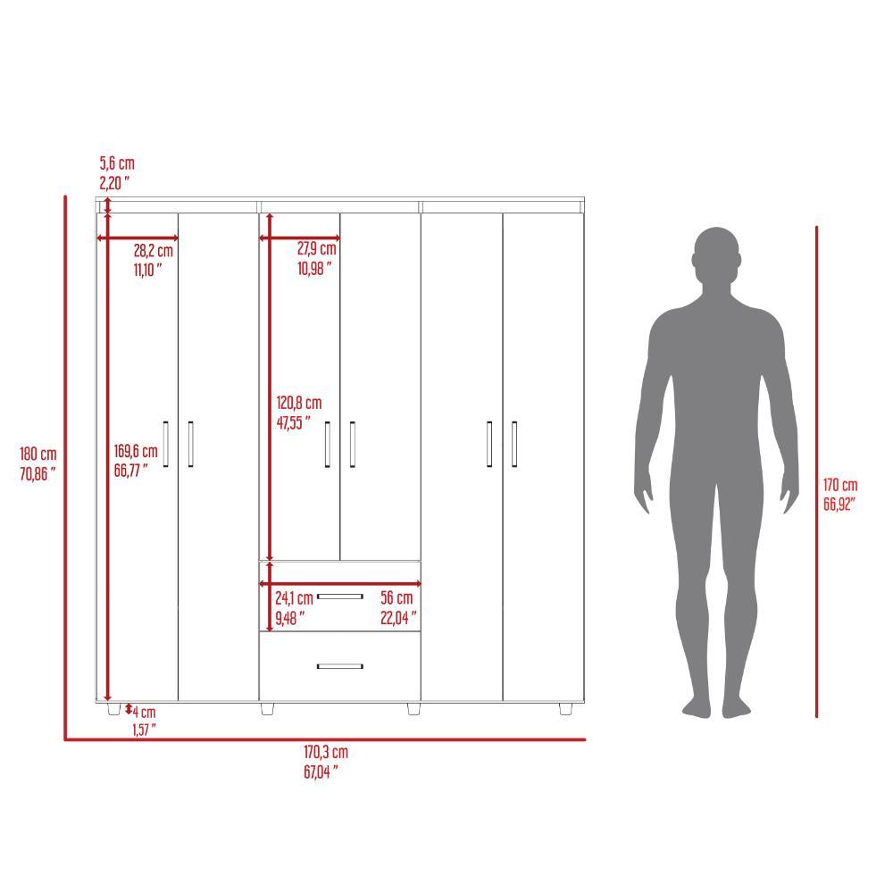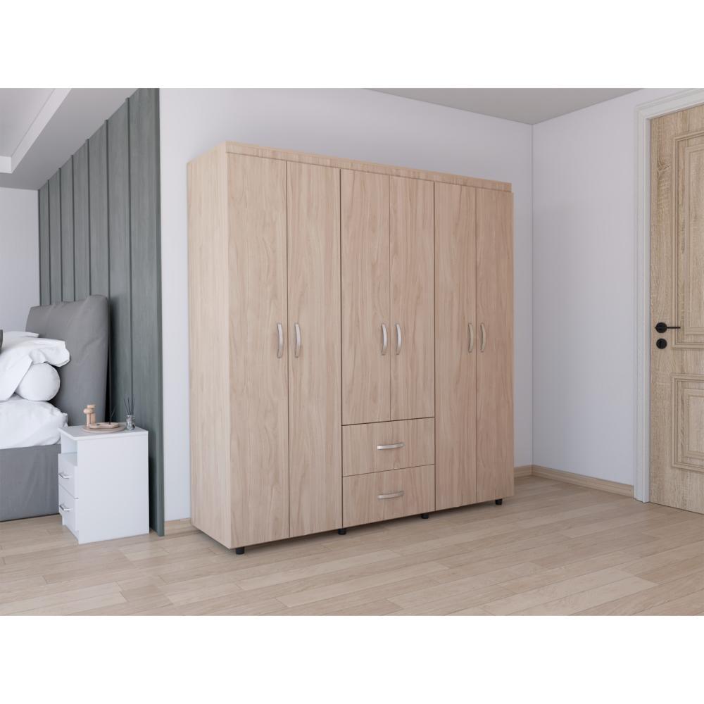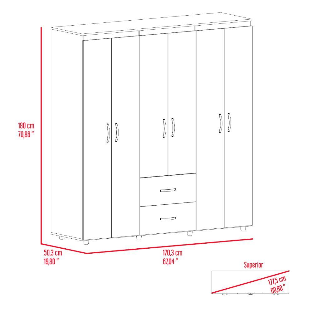 Closet, con amplios espacios y entrepaños para organizar, 6 puertas abatibles, 3 tubos cromados, 2 cajones organizadores, y deslizadores de plástico para apoyo al piso.