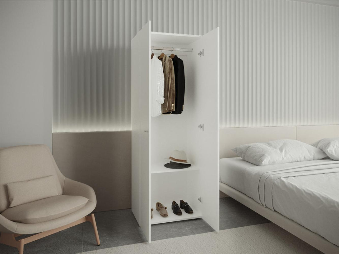 Closet, con 2 puertas abatibles, 1 entrepaños, 1 Tubo para colgar, con espacio para almacenar ropa y objetos, 2 botones en aluminio y es de facil instalación.