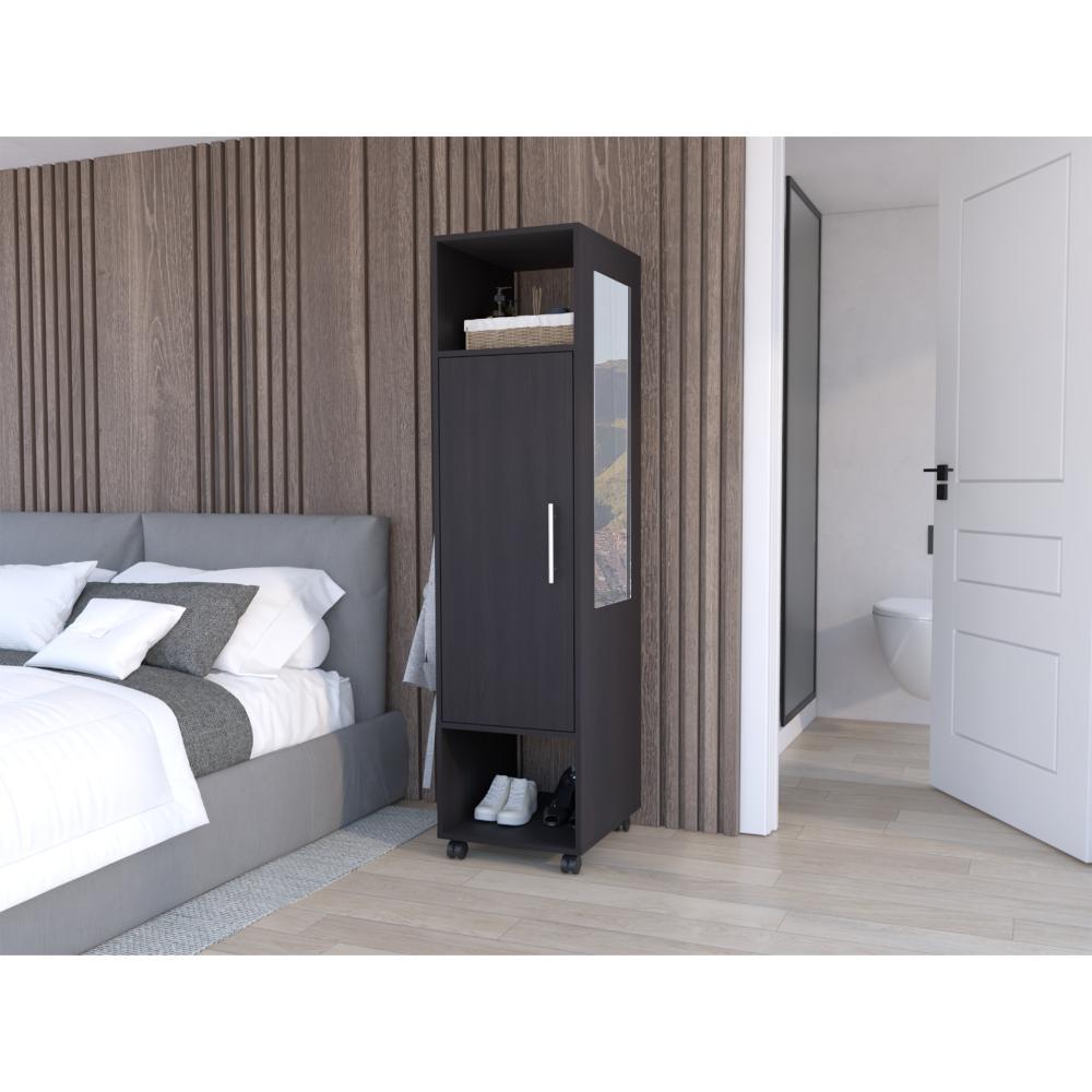 Closet, con tres espacios para guardar ropa, rodachinas con y sin freno para desplazamiento, puerta y un espejo en el lateral.