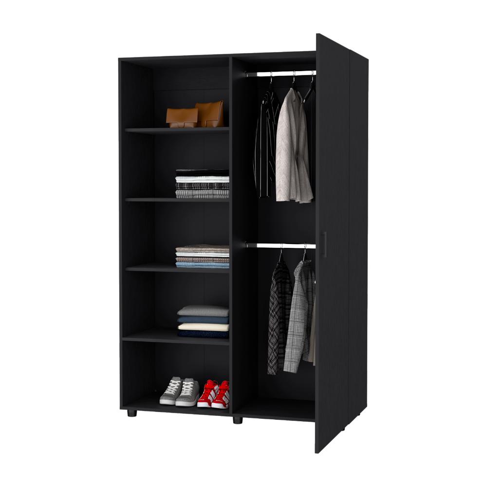 Closet, con una puerta batiente, dos tubos para colgar ropa, amplios espacios para guardar ropa.