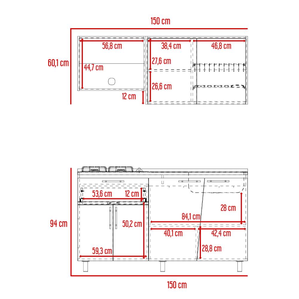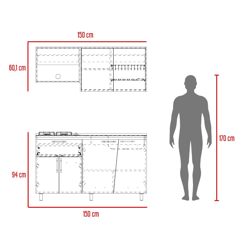 Cocina Integral, con dos puertas abatibles, incluye locero y portavasos, espacio para alimentos utensilios de cocina y decorativos, modulo independiente para campana extractora, el modulo inferior cuenta con 4 puertas abatibles, 1 cajón, patas metálicas negras, con amplio espacio para guardar alimentos, electrodomésticos u otros. *INCLUYE MESÓN*