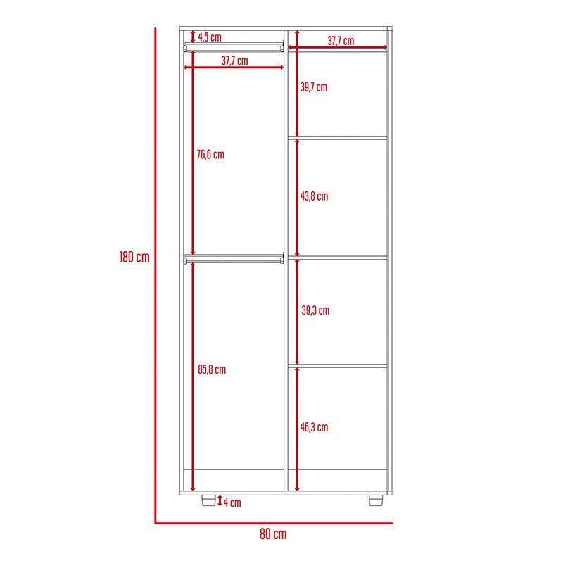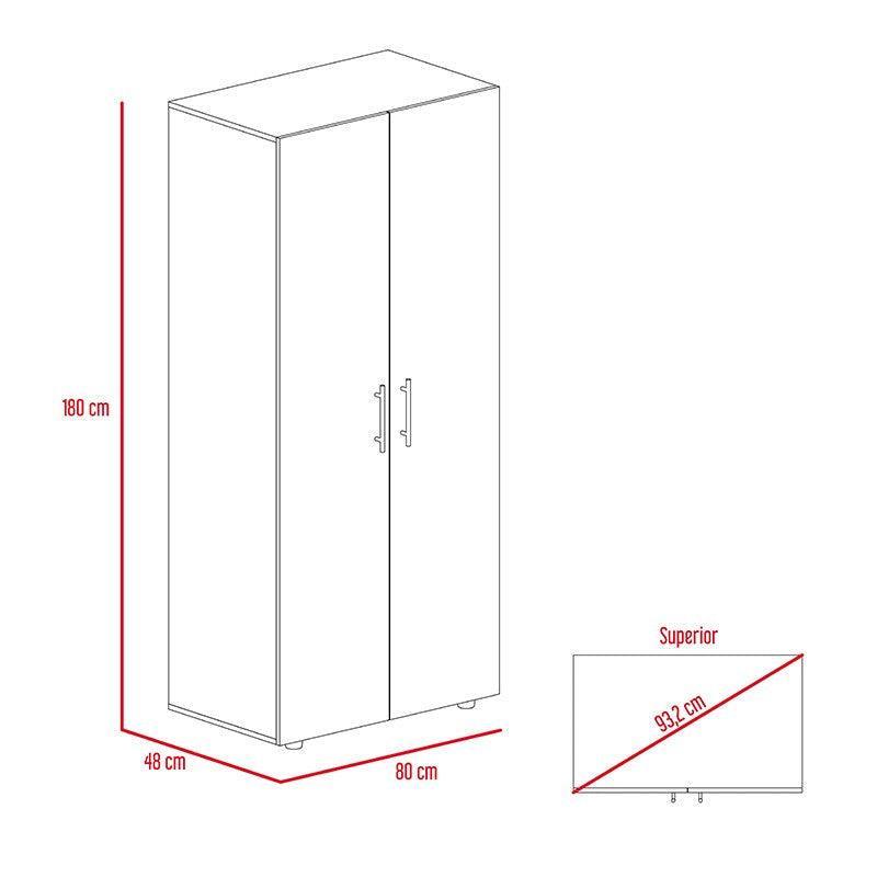 Closet, con 2 puertas abatibles, 2 tubos para colgar prendas, y 3 entrepaños para organizar. Color Wengue