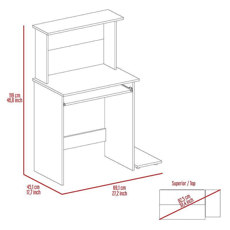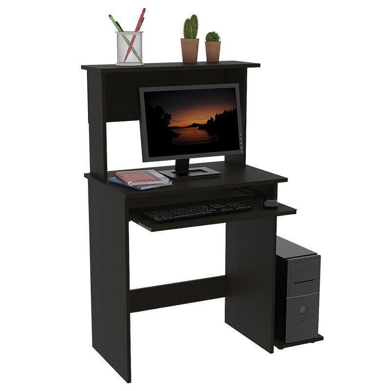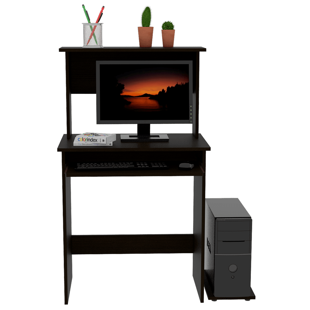 Escritorio, para PC con pantalla hasta 19”, porta teclado con rieles metálicos, espacio para objetos de entretenimiento y estudio y plataforma móvil para CPU. Color Wengue