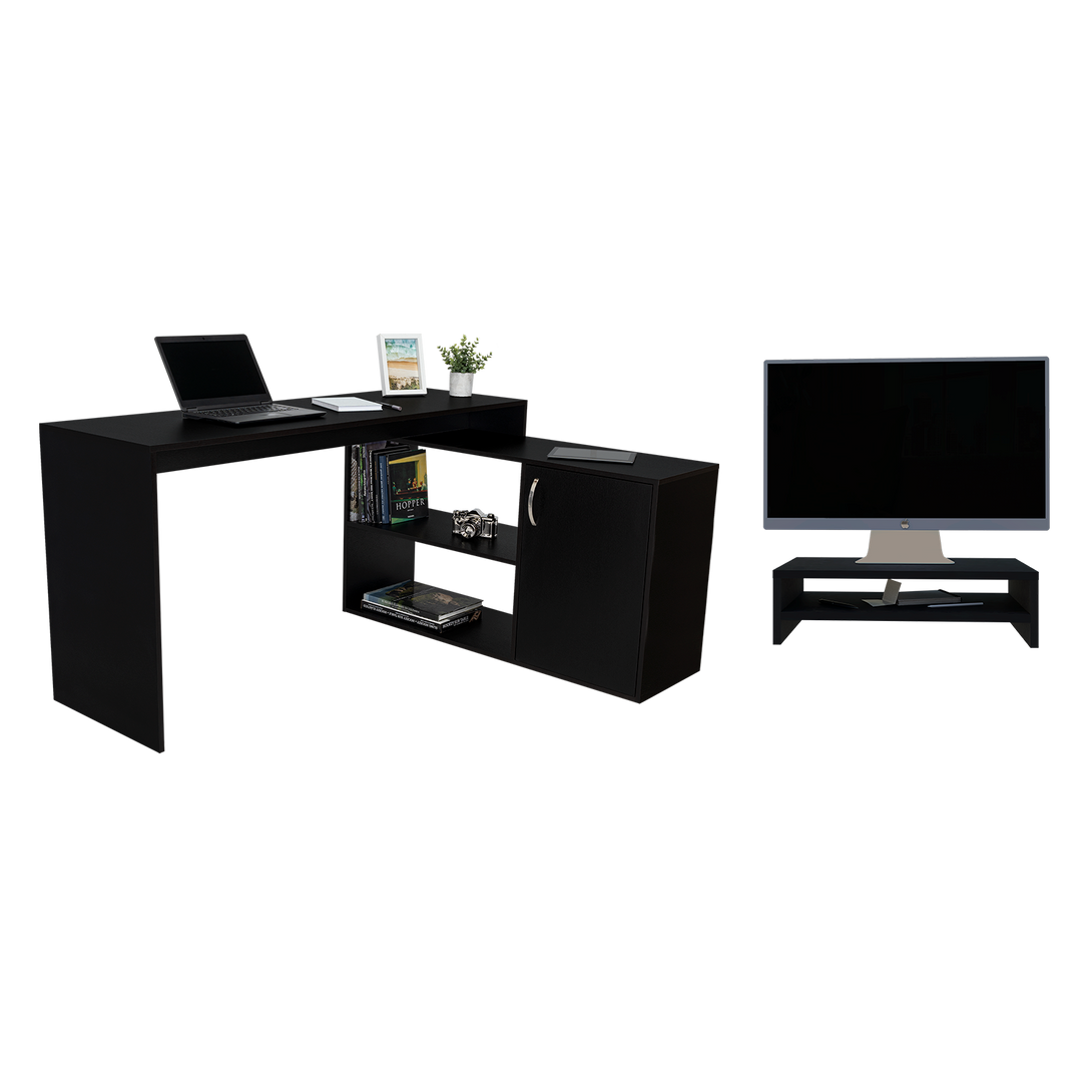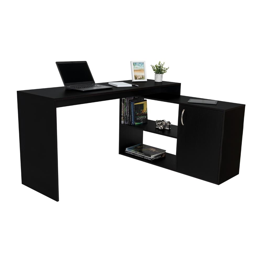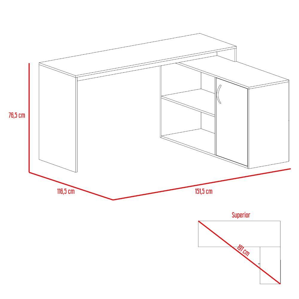 Escritorio en L, cuenta con amplia superficie de trabajo y el eje de lateral tiene amplios entrepaños para ubicar libros u otros elementos de trabajo y estudio, y un práctico espacio con puerta para almacenar múltiples objetos. Ideal para el hogar o la oficina, incluye manual para ensamble.