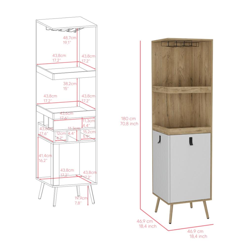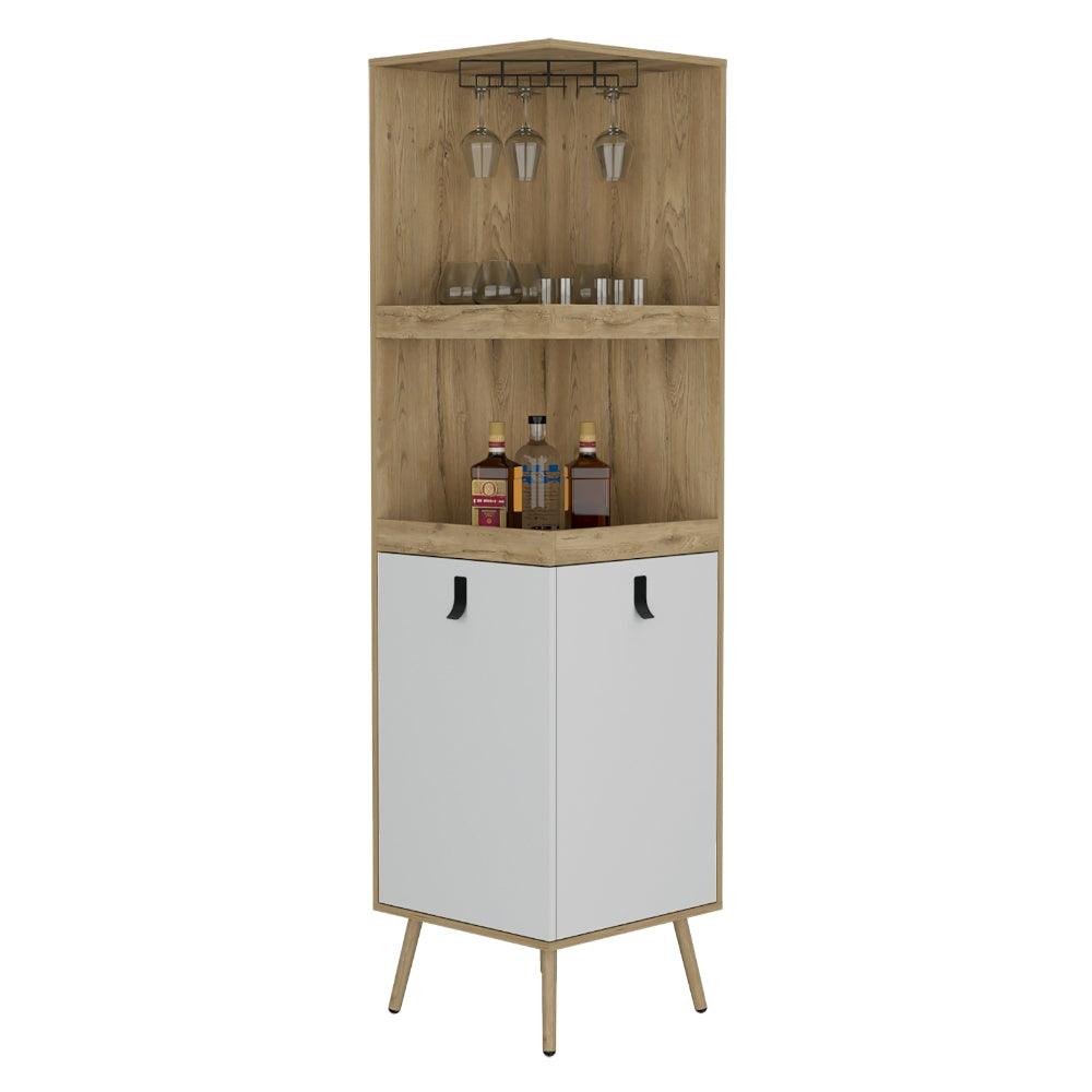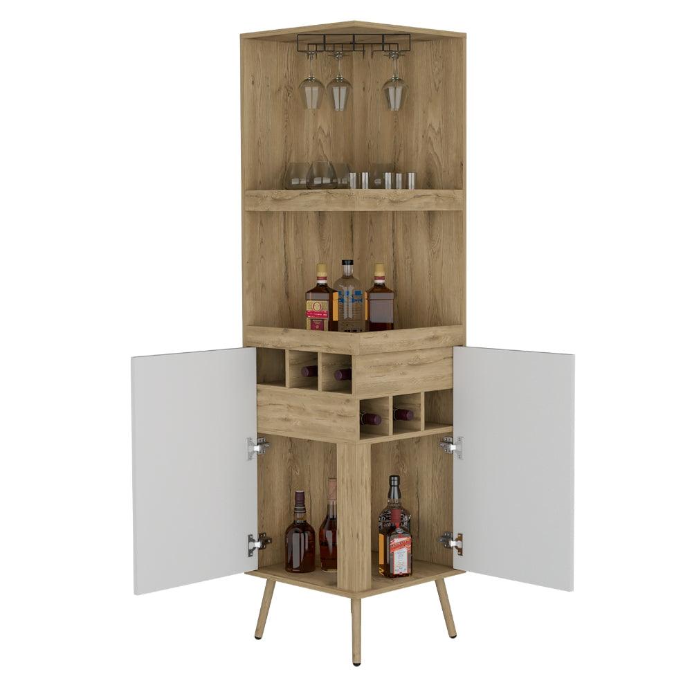 Bar Esquinero, con espacio superior para copas de vino, espacio para organizar licores, patas metálicas con acabado madero.