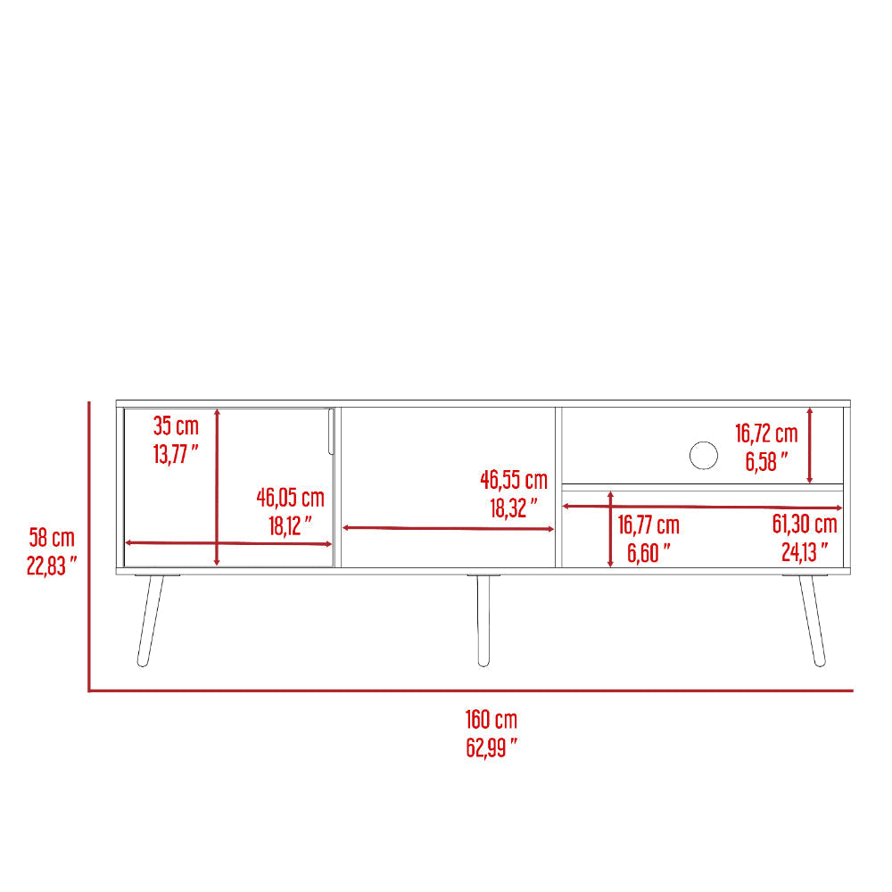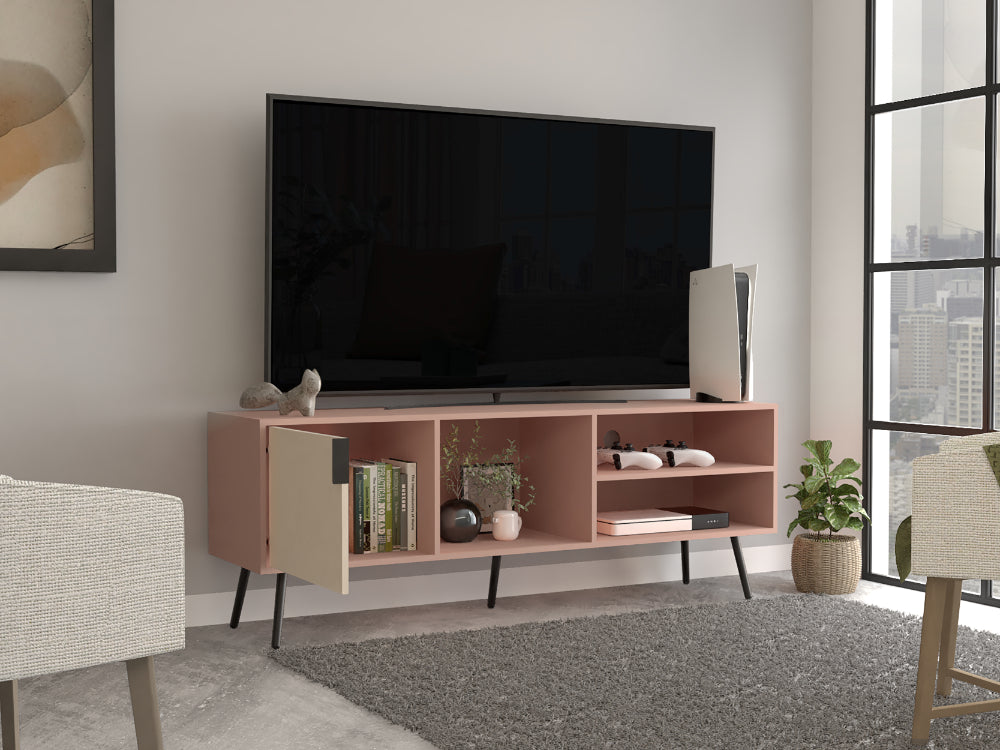 Mesa para TV de 65'' con una puerta abatible, diseño moderno, fácil armado, patas metálicas.