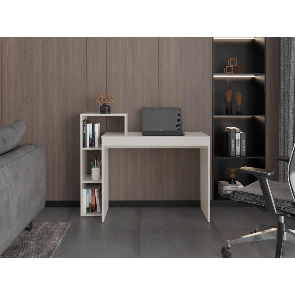 Escritorio, con amplia superficie de trabajo, múltiples espacios para ubicar objetos, diseño sencillo
