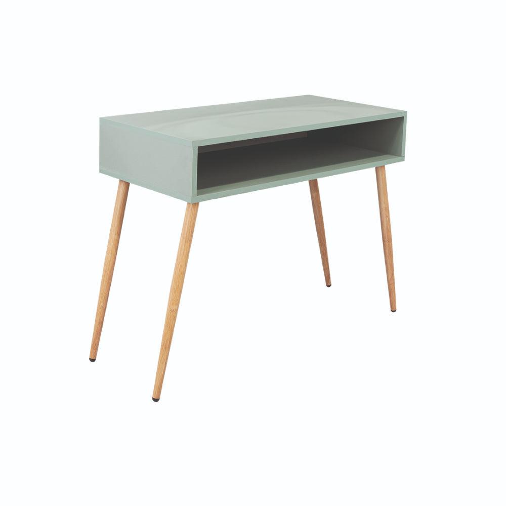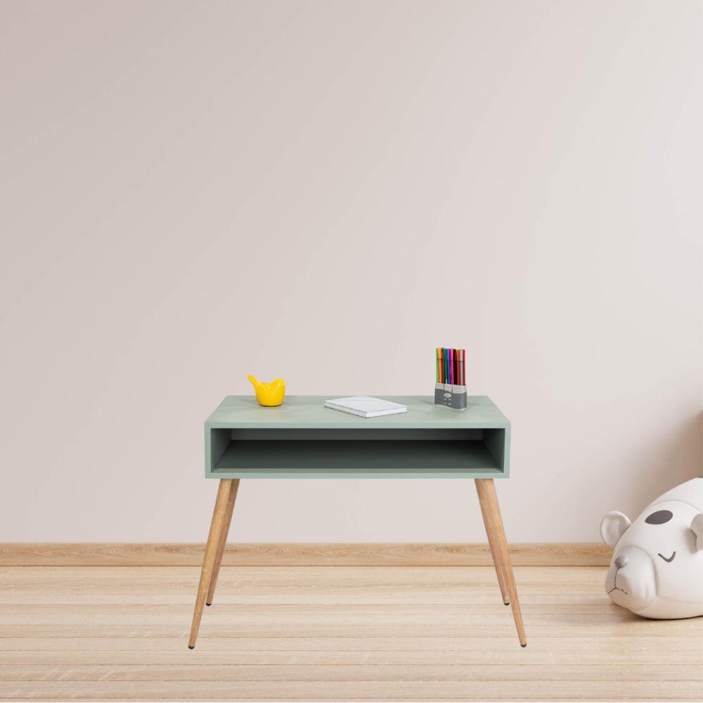 Escritorio con patas en madera clara diagonal y mesa en color Agave, contiene tarugos y requiere armado.