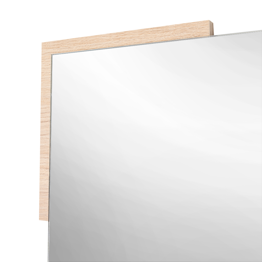 Espejo rectangular con dos extremos en madera clara; ensamble a la pared con chaflán