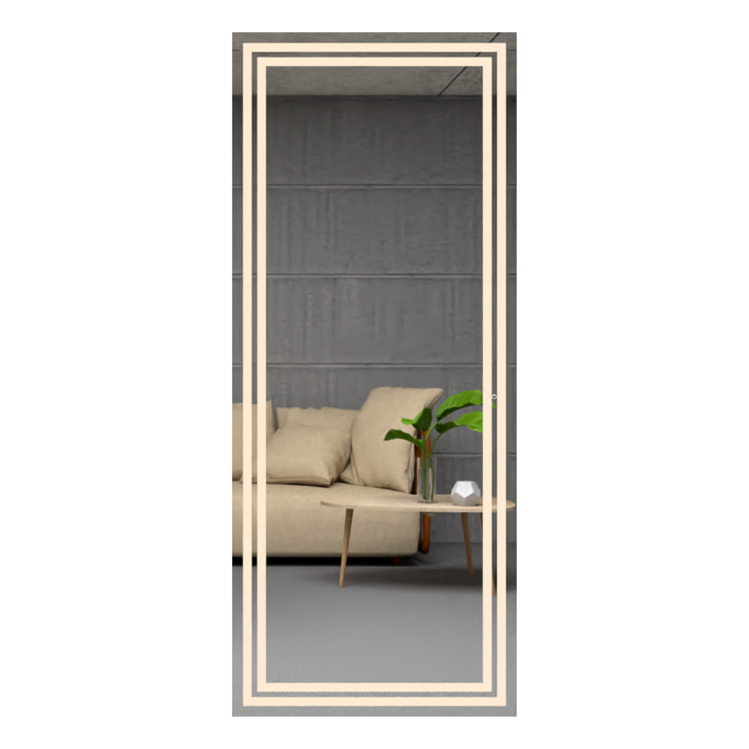 Espejo rectangular con diseño en sandblasting, con luz led, ensamble a la pared con chaflan.