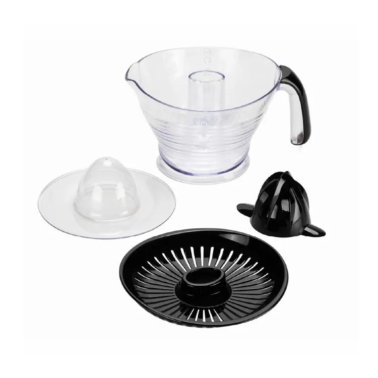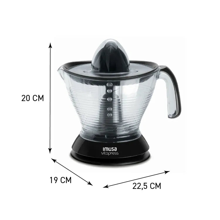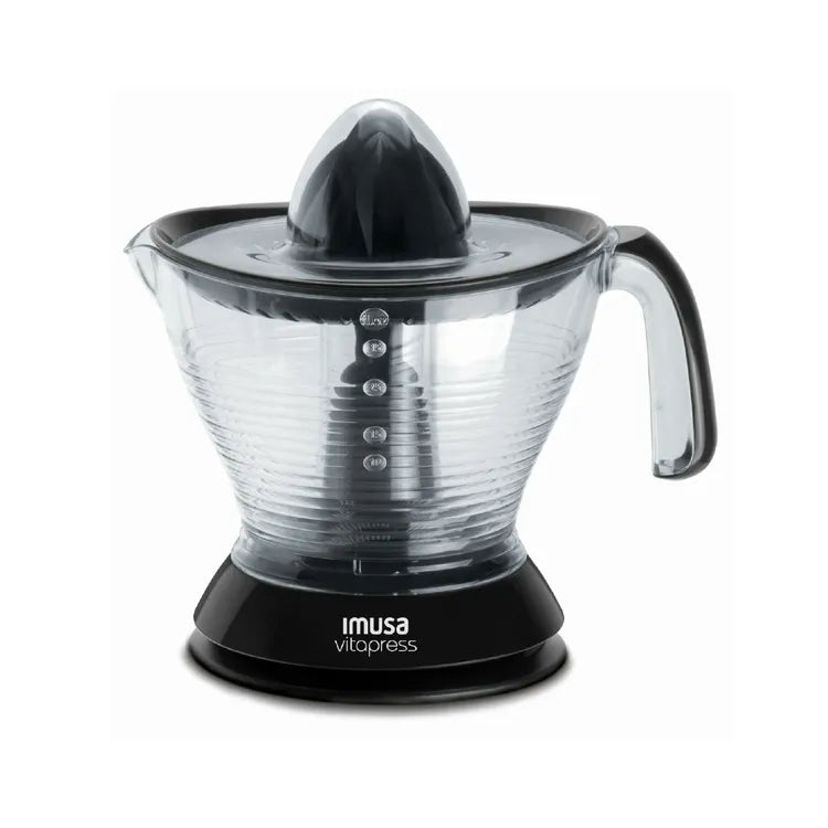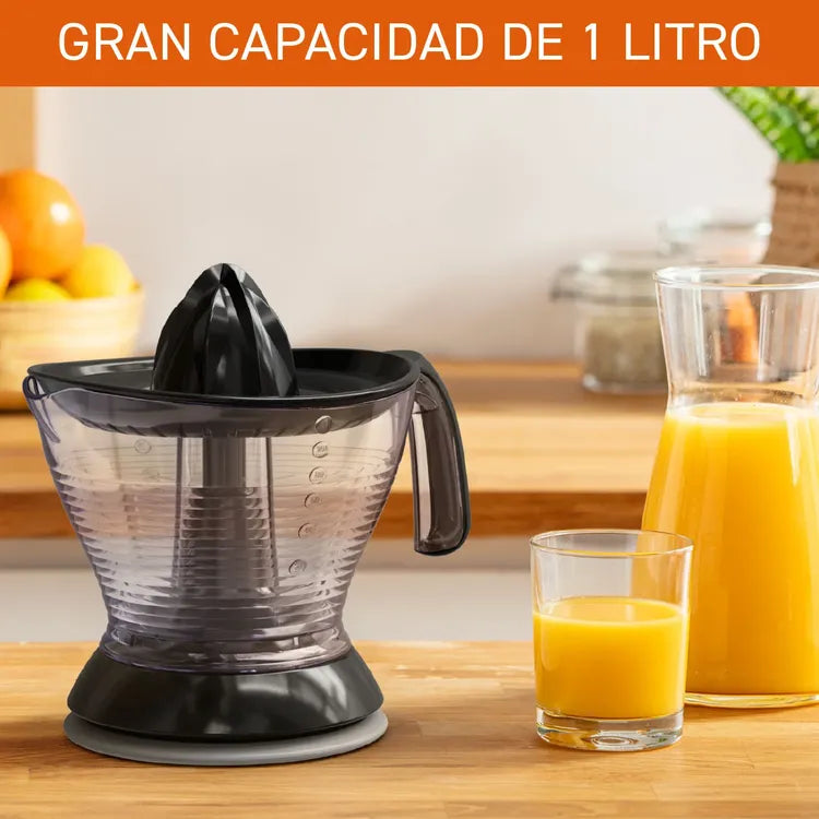 Exprimidor Vitapress Color Negro, 30 watts de potencia, Capacidad de 1L, Motor de doble rotación con accionamiento automático, Tapa de protección, Filtro plástico removible, Partes desmontables para facilitar la limpieza, Hecho en Colombia.