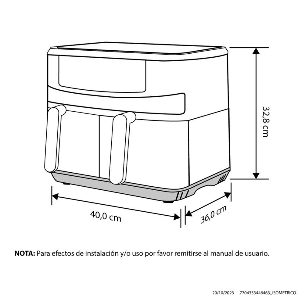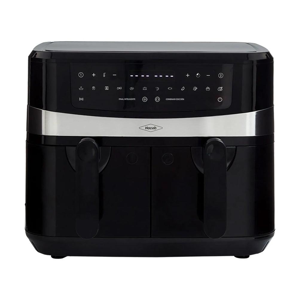 Doble capacidad para recetas más grandes, en simultáneo y sin necesidad de usar aceite con la freidora Haceb doble canasta. Tiene capacidad de 8 litros, control de tiempo y temperatura en el panel digital y sorpréndete con los 12 programas predeterminados para disfrutar de las recetas más exquisitas. Material antiadherente para su fácil limpieza y el diseño con acabados inox que adornarán tu cocina.
