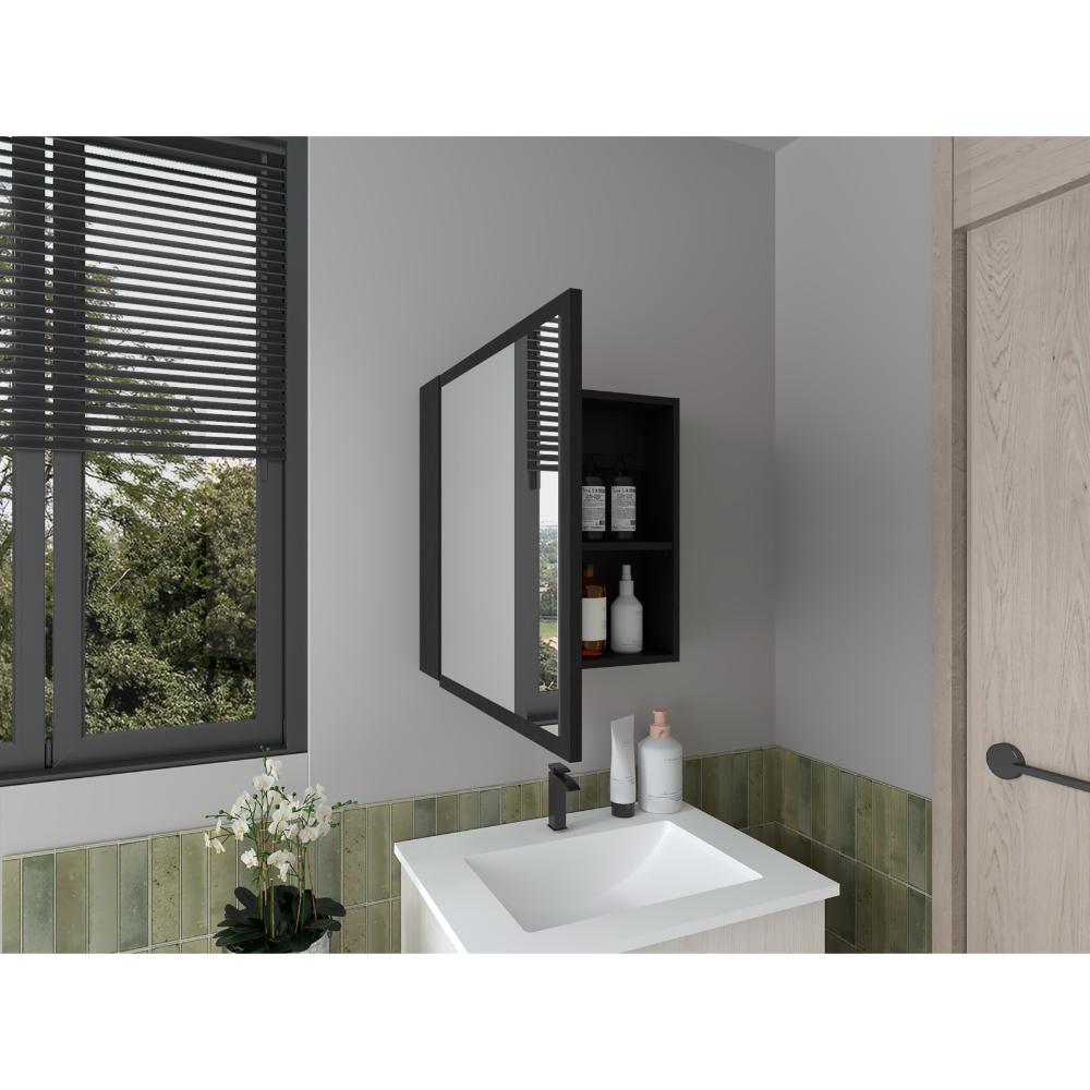 Gabinete de baño, con 1 puerta abatible, 1 espejo, y múltiples entrepaños para objetos de aseo personal.
