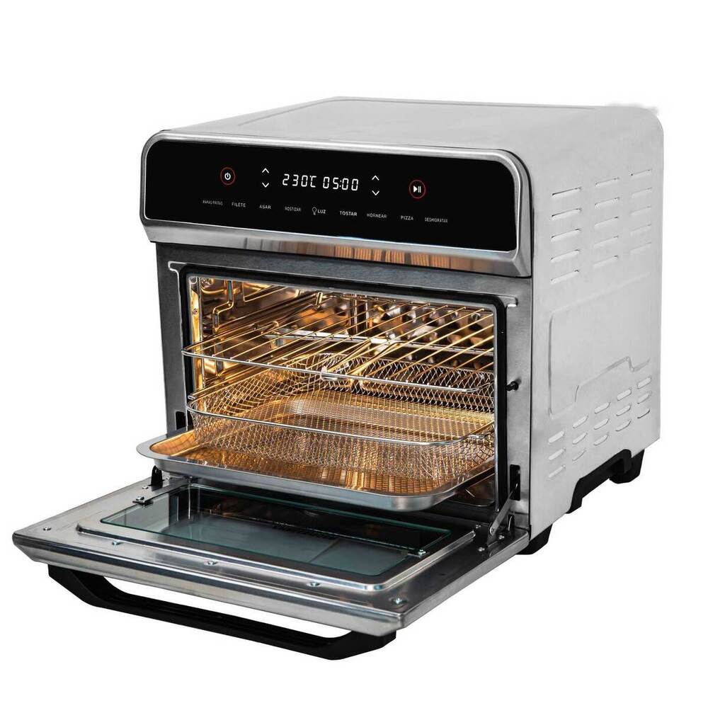 Nuevo Horno freidor de aire con panel digital de 23 litros , cuenta con 11 programas. Permite tostar, hornear, asar, freír con aire papas, pollo, pizza, vegetales y deshidratar. Incluye rosticero (Asador), Cesta freidora de aire, Parrilla, Bandeja para hornear, Bandeja para migas, Accesorio para bandejas y parrilla.