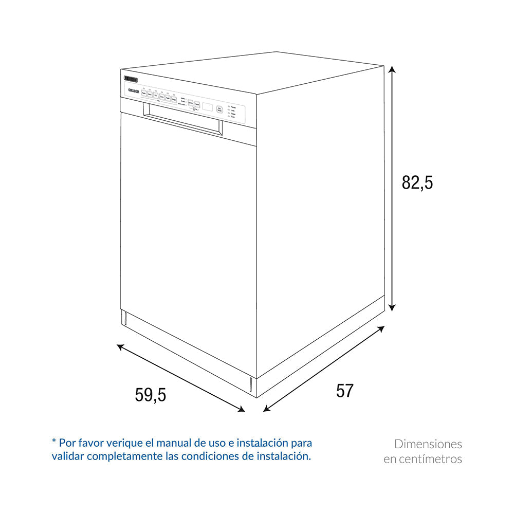 Acabado : Acero Inox / Dimensiones producto : (Ancho x Alto x fondo) 59,5 cm x 82,5 cm x 57,0 cm / Lavavajillas para empotrar : SI / Alimentación : 120 Va.c 60 Hz / Potencia de consumo máximo : 920 W / Corriente Máxima : 7,67 A / 6 Programas de lavado / Interior en acero inoxidable : SI / Indicador de error : SI / Entrada de agua :Fría o Caliente / Canastas (2) / Display : SI / Bloqueo de funciones : SI