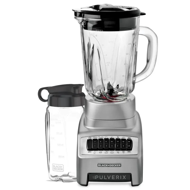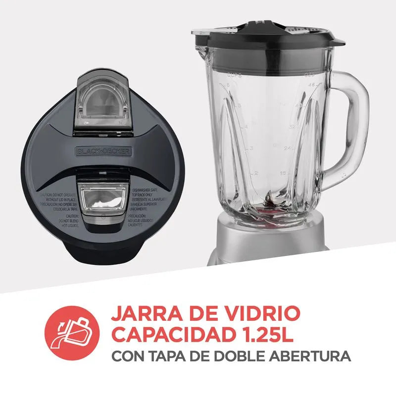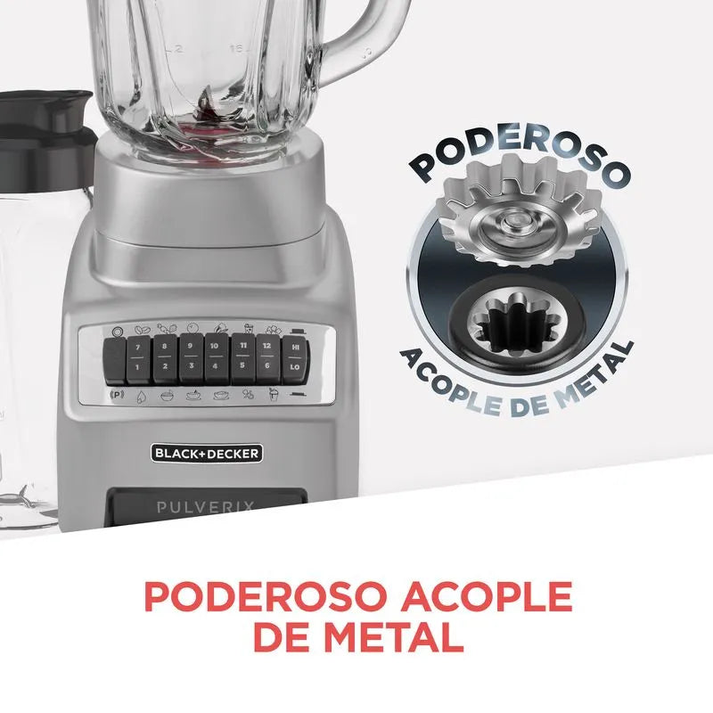 Licuadora 700 W de Potencia, Jarra Pulverix con diseño exclusivo con capacidad de 1.5L, Acople de metal completo fuerte y duradero, 12 velocidades y función de pulso, Tapa con doble apertura. Incluye vaso personal de 500ml.