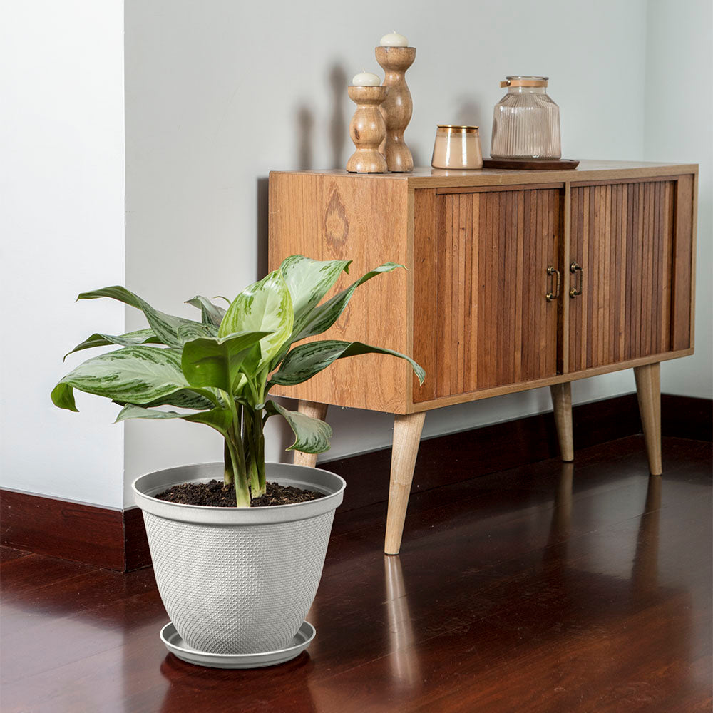 La Matera Redonda Rafia 30 cm con Plato es ideal para resaltar tus plantas con un estilo natural y elegante. Fabricada con materiales duraderos y diseñada para imitar la textura de la rafia, esta matera aporta un toque estético a cualquier ambiente. Incluye un plato a juego que ayuda a evitar derrames, manteniendo tus superficies limpias. Perfecta para uso en interiores y exteriores.