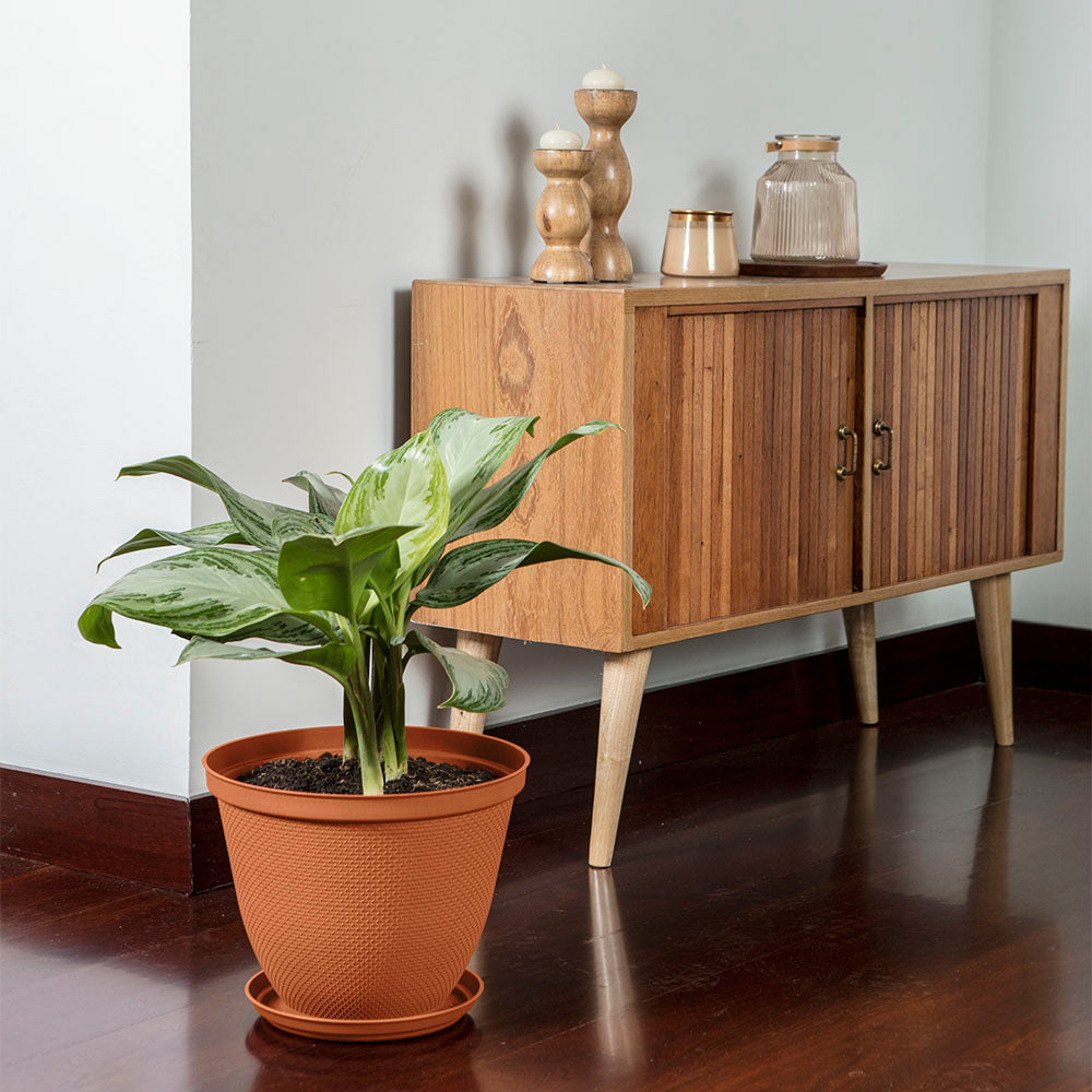 La Matera Redonda Rafia 30 cm con Plato es ideal para resaltar tus plantas con un estilo natural y elegante. Fabricada con materiales duraderos y diseñada para imitar la textura de la rafia, esta matera aporta un toque estético a cualquier ambiente. Incluye un plato a juego que ayuda a evitar derrames, manteniendo tus superficies limpias. Perfecta para uso en interiores y exteriores.