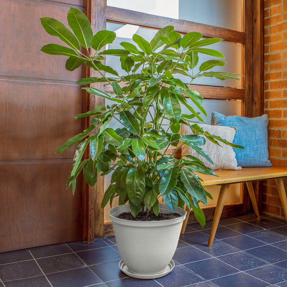 La Matera Redonda Rafia 35 cm con Plato es ideal para añadir un toque natural y elegante a tus plantas. Fabricada con materiales duraderos, su diseño imita la textura de la rafia, brindando un aspecto decorativo único. Incluye un plato a juego que evita derrames y protege tus superficies. Perfecta para interiores y exteriores, esta matera combina estilo, funcionalidad y resistencia.