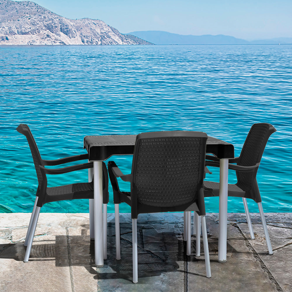 Mesa SHIA apariencia Rattan, con tejido perforado que imita el tejido artesanal. Exclusiva mezcla de materiales con patas en aluminio que no se oxidan. Cuenta con un tacón nivelador. La mesa es cuadrada con una medida de 85 x 85 cm. Tiene un tapón de centro especial para parasol. Fácil de armar, no requiere herramientas. Fácil de limpiar.