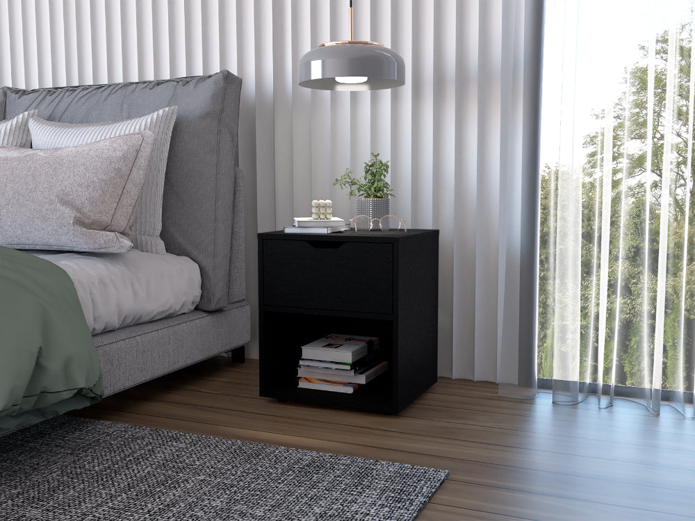 Mesa de Noche, con un cajón, espacio para colocar objetos decorativos, deslizadores pasticos