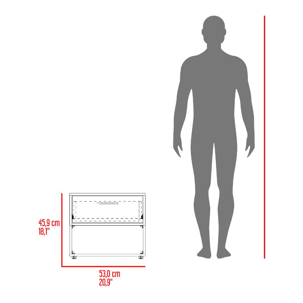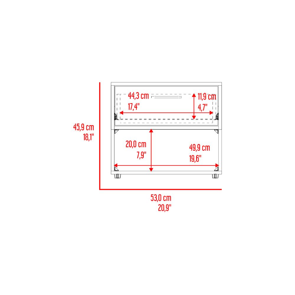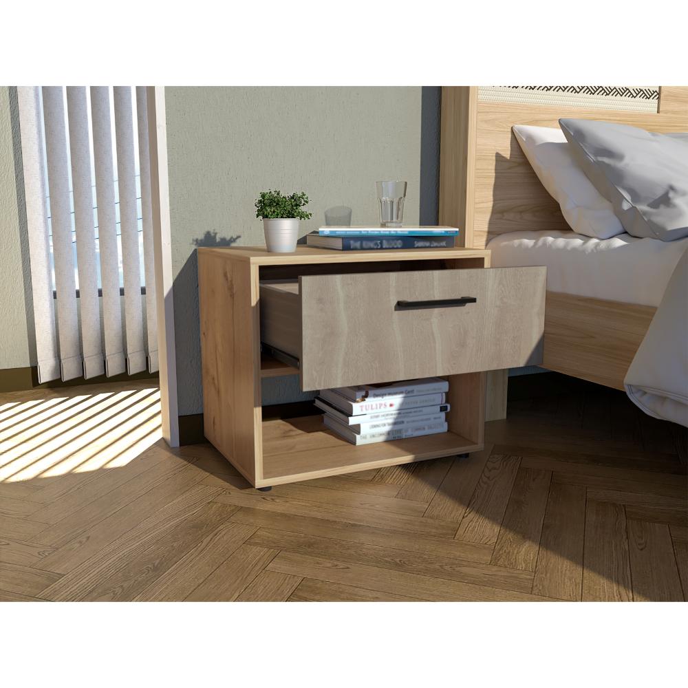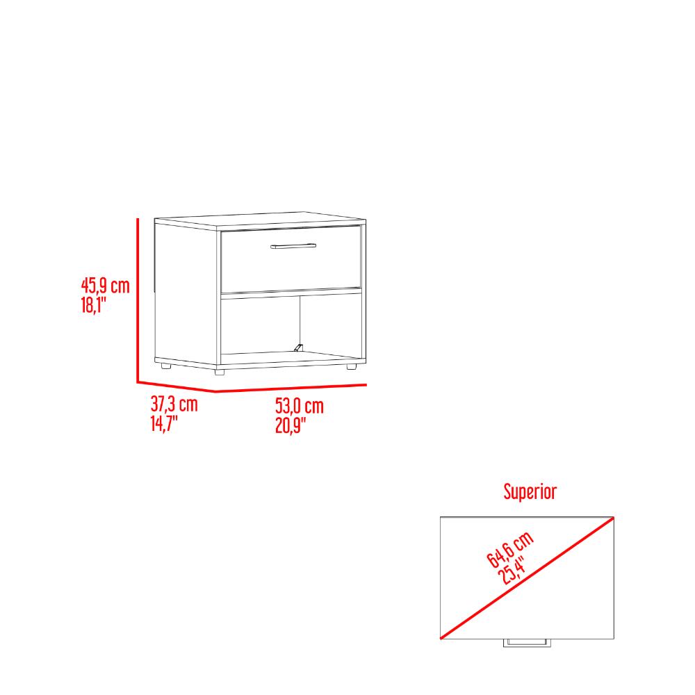 Mesa de Noche, con un cajón con manija metálica, espacios para colocar objetos decorativos, deslizadores plásticos.