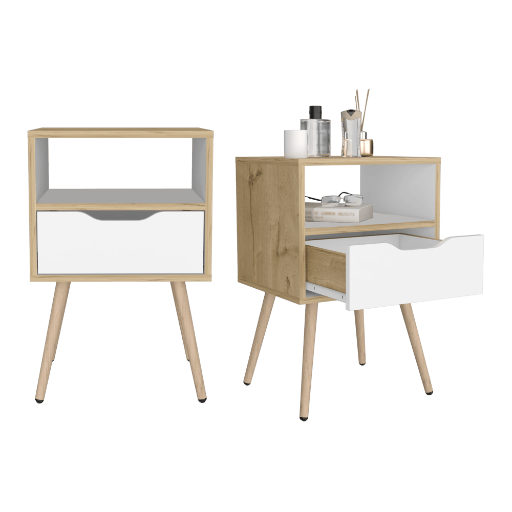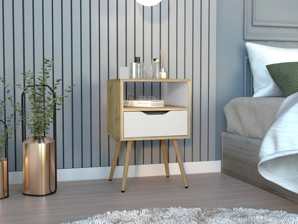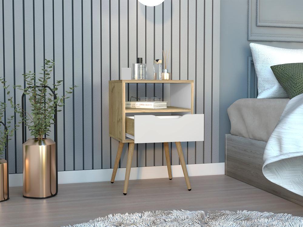 Mesa de Noche Alesio, Café Claro y Blanco, con Patas en Madera y un Cajón X2