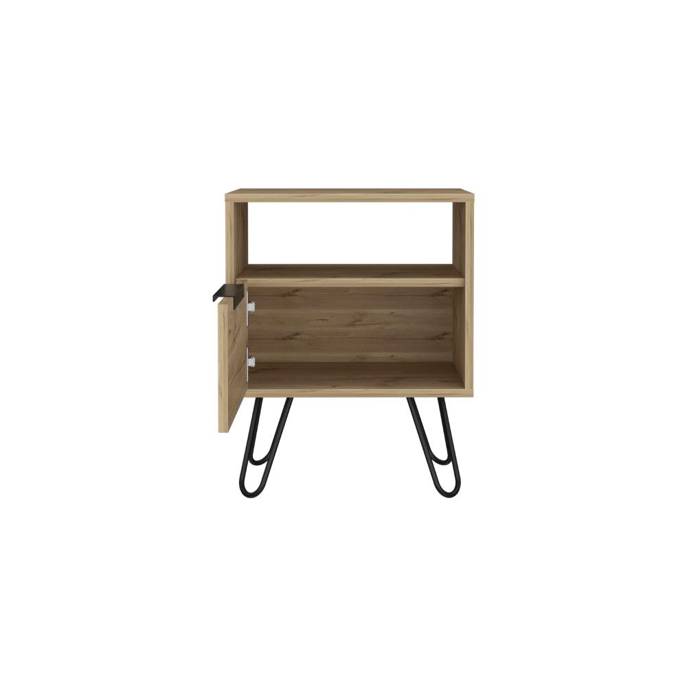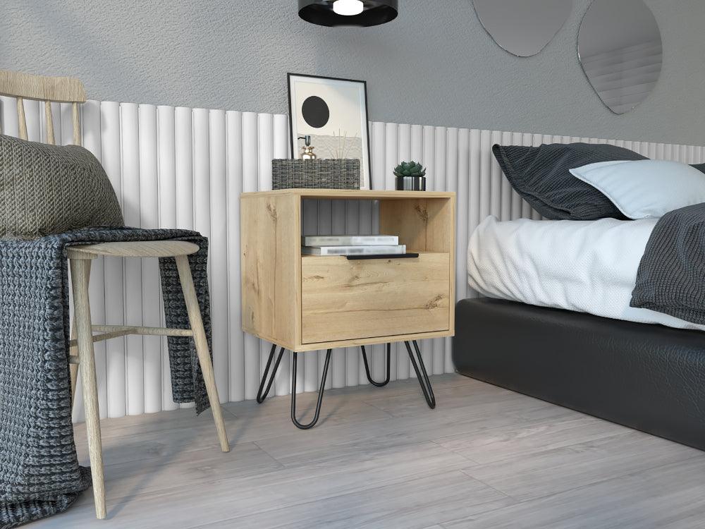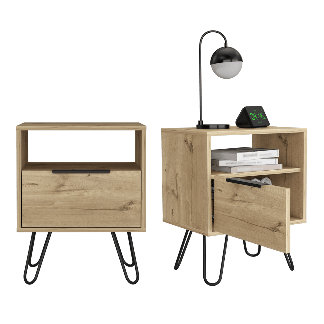 Mesa de Noche, con dos cajones, patas metálicas, dos manijas, soporta 26 kg