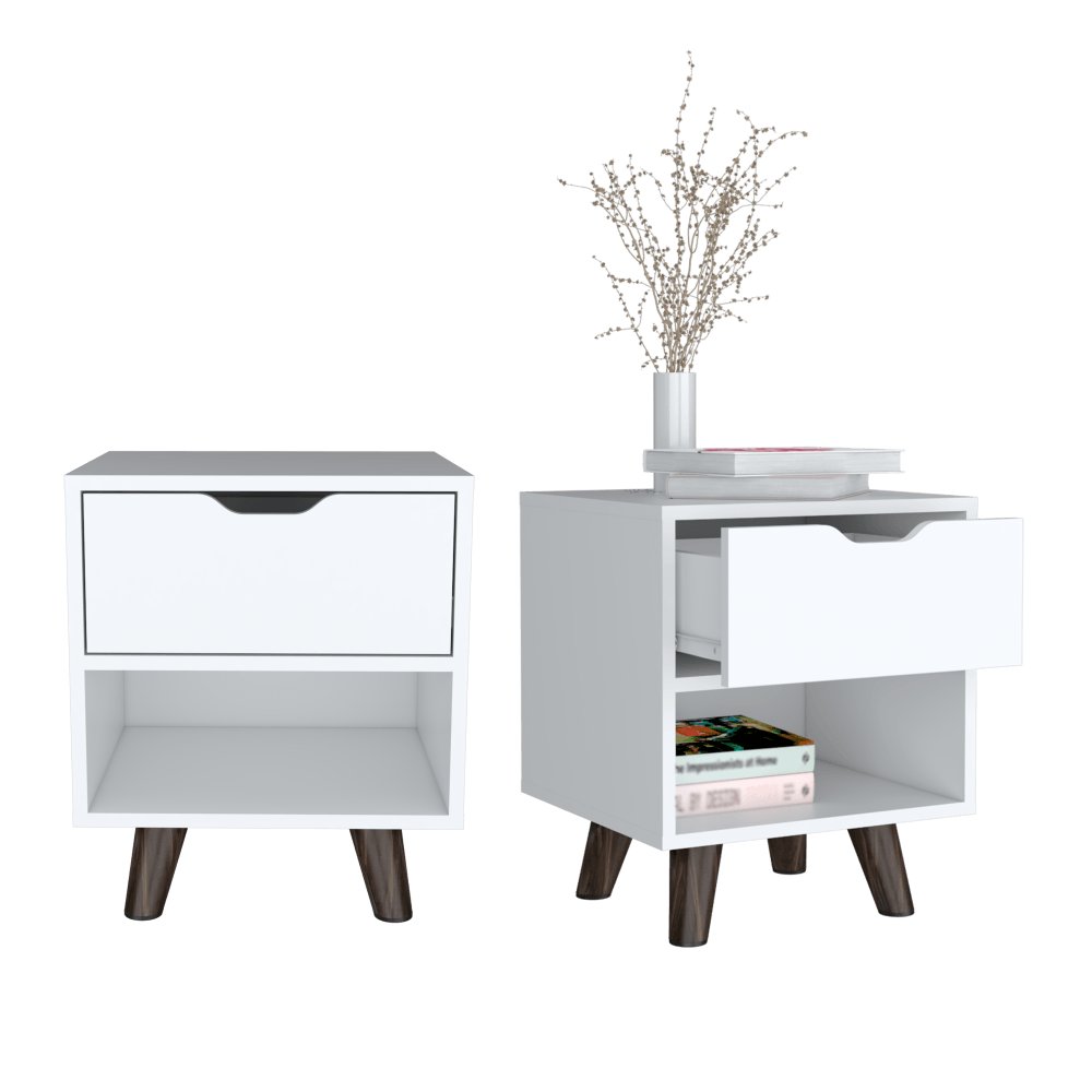 Mesa de Noche Canelo, Blanco, con Patas en Madera y un Cajón ZF X2